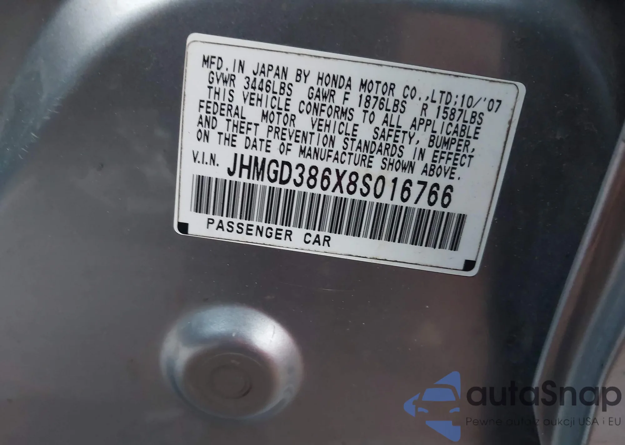 • VIN JHMGD386X8S016766
