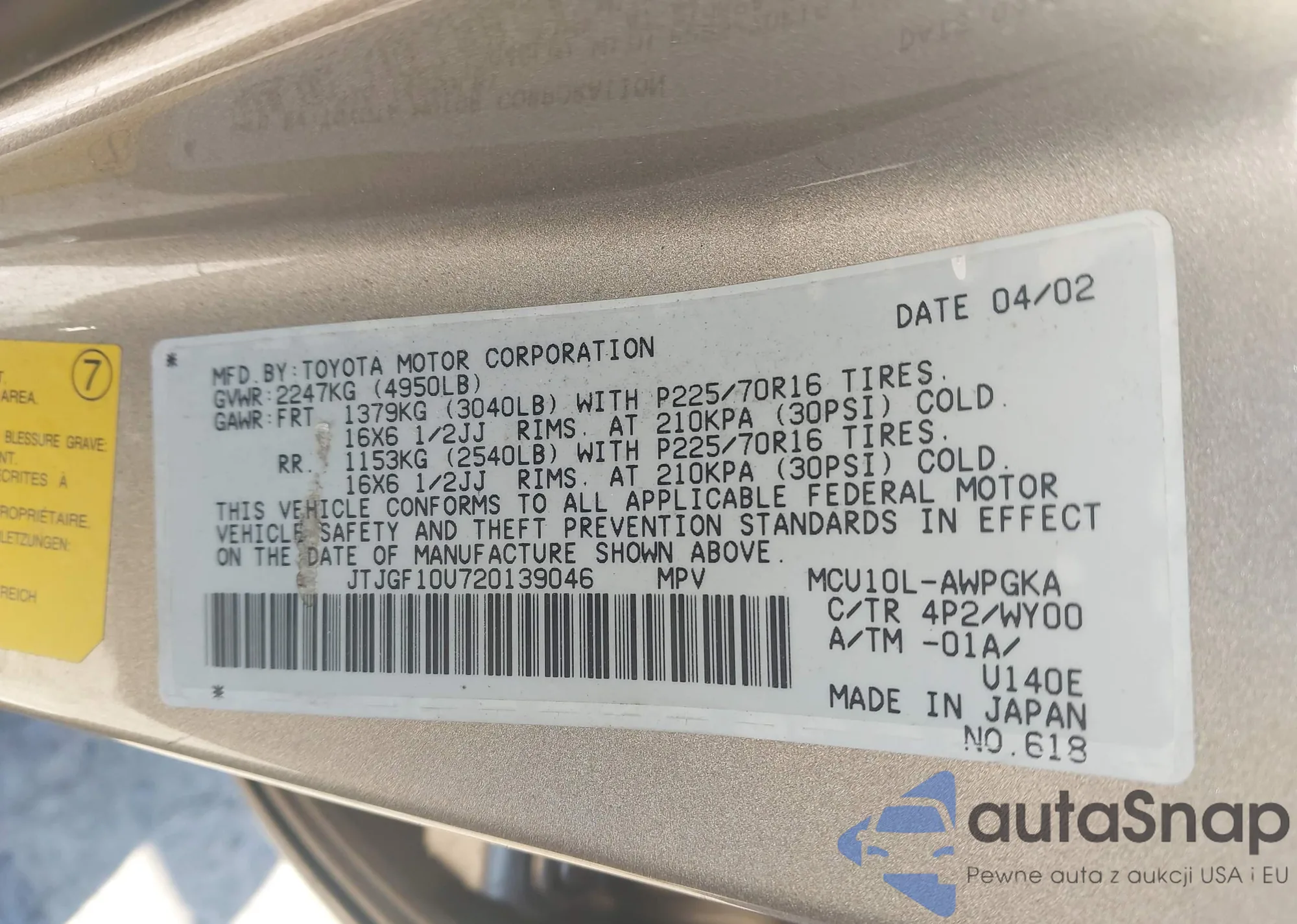 LOT: 43981845 VIN: JTJGF10U720139046