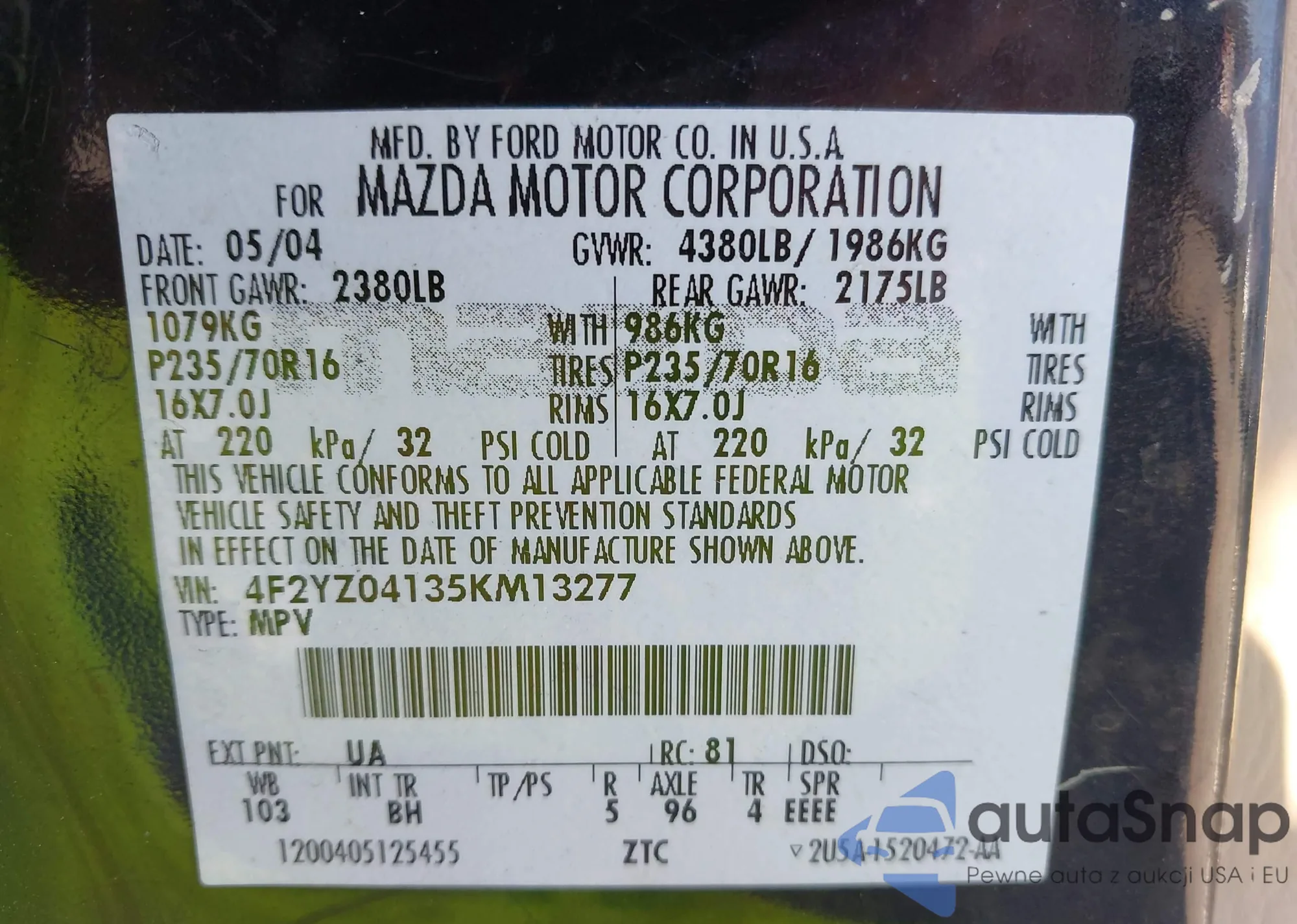 • VIN 4F2YZ04135KM13277