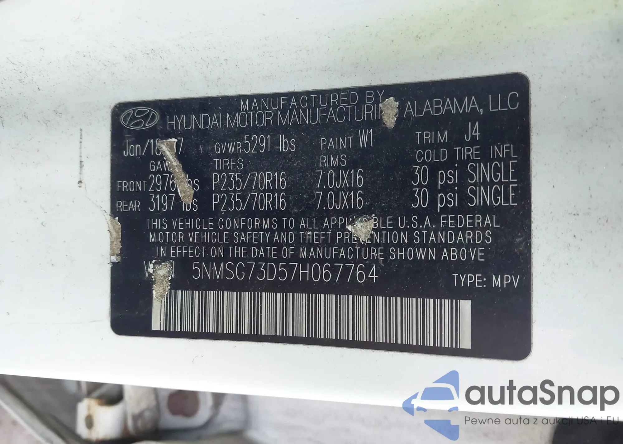 • VIN 5NMSG73D57H067764