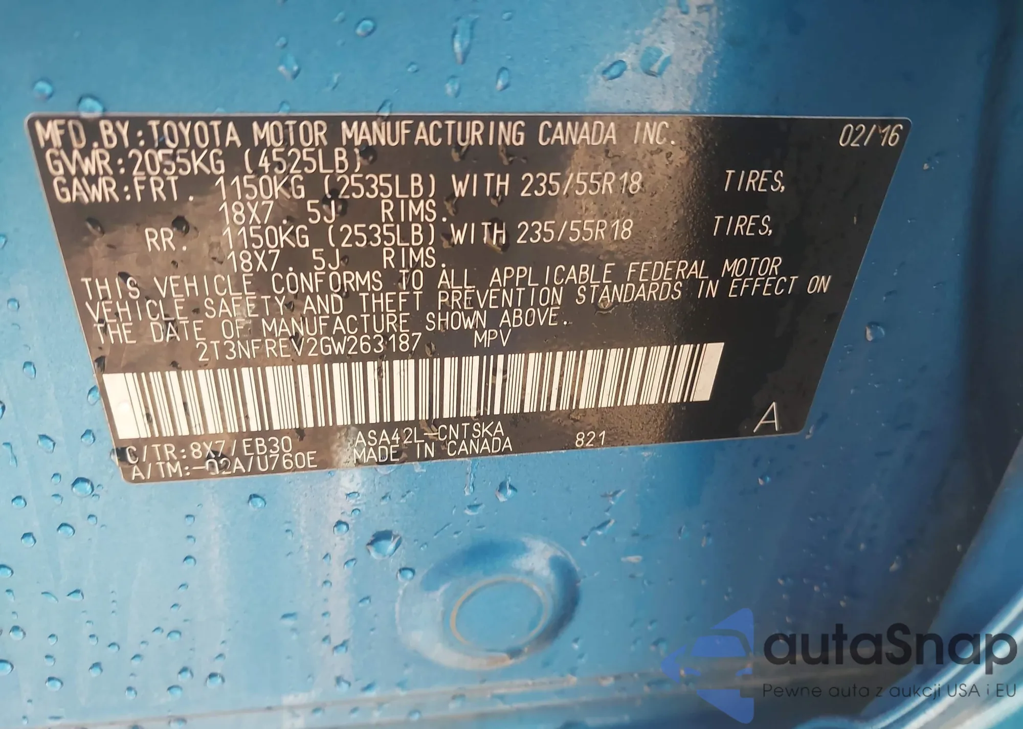 LOT: 43813807 VIN: 2T3NFREV2GW263187