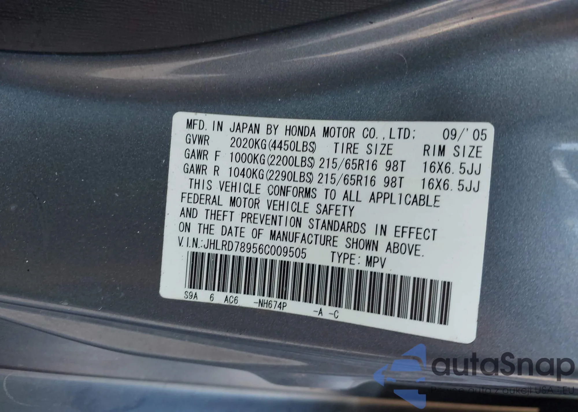 • VIN JHLRD78956C009505