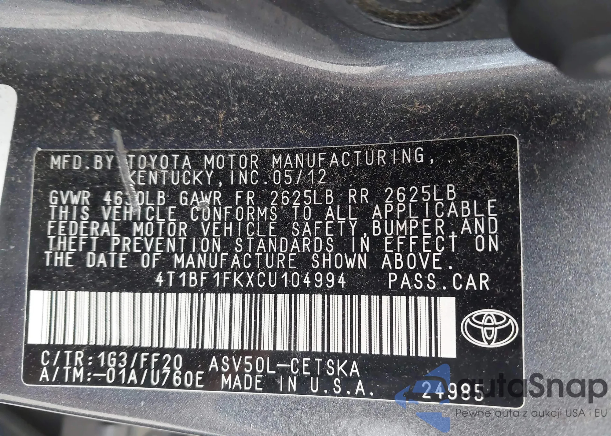 • VIN 4T1BF1FKXCU104994