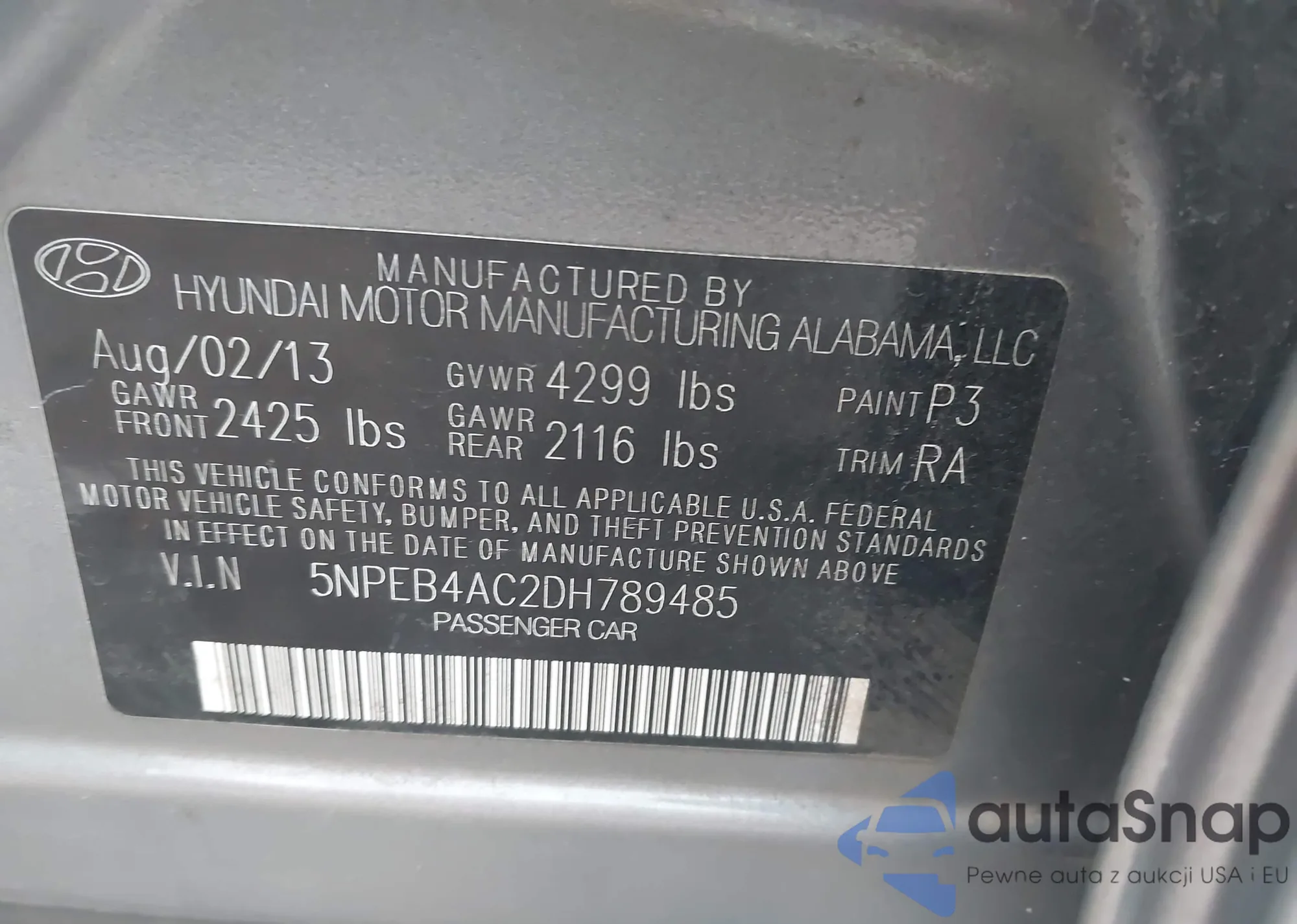 LOT: 43849236 VIN: 5NPEB4AC2DH789485