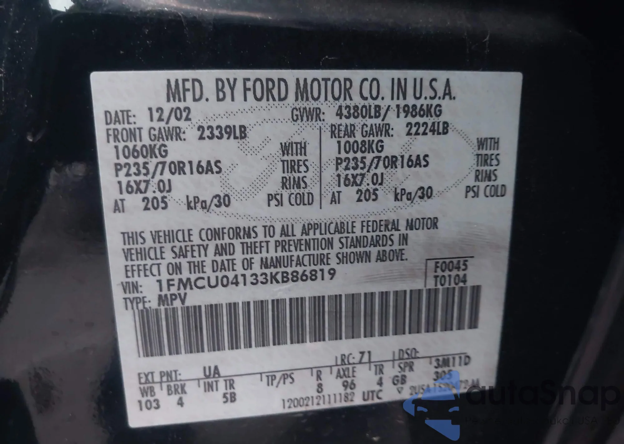LOT: 44004258 VIN: 1FMCU04133KB86819