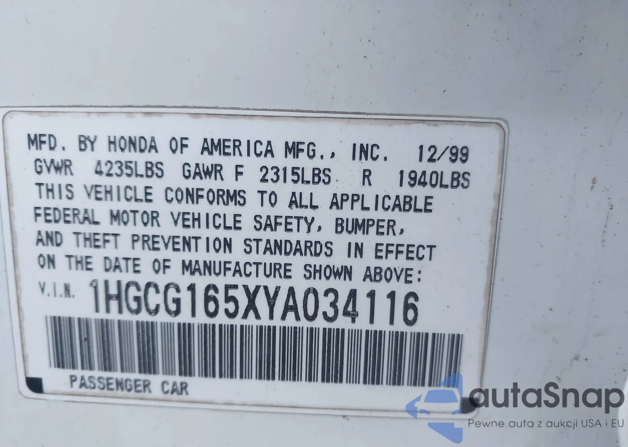 LOT: 44101066 VIN: 1HGCG165XYA034116