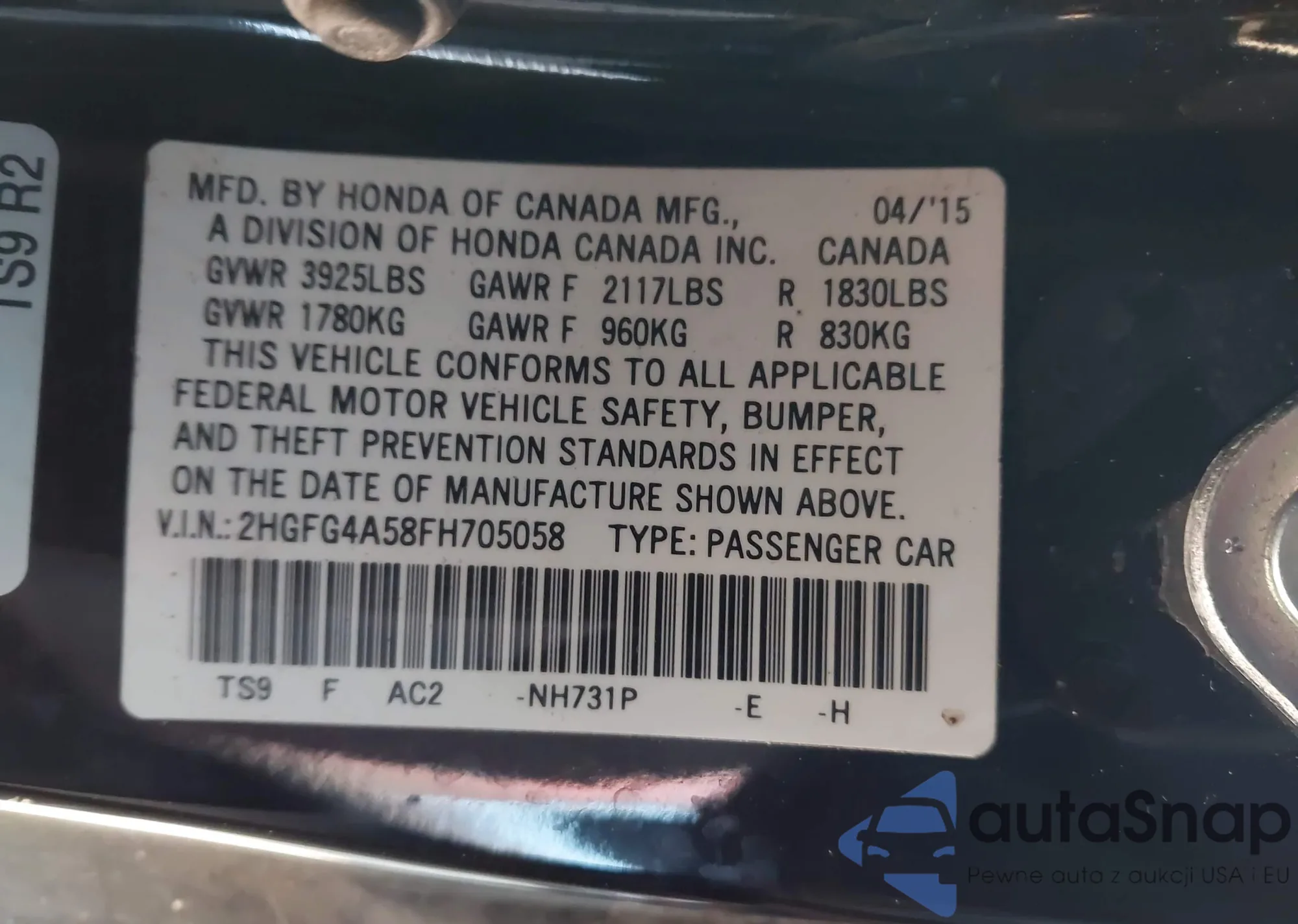 LOT: 43880947 VIN: 2HGFG4A58FH705058