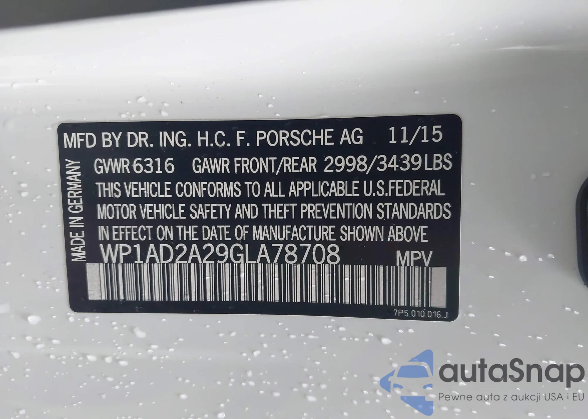 LOT: 43692299 VIN: WP1AD2A29GLA78708