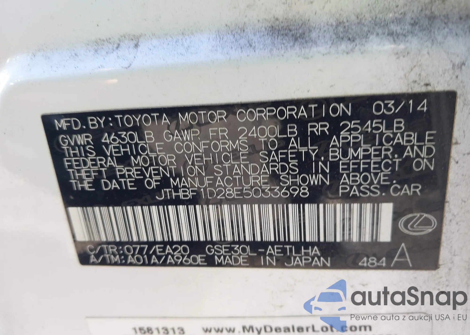 LOT: 44014270 VIN: JTHBF1D28E5033698