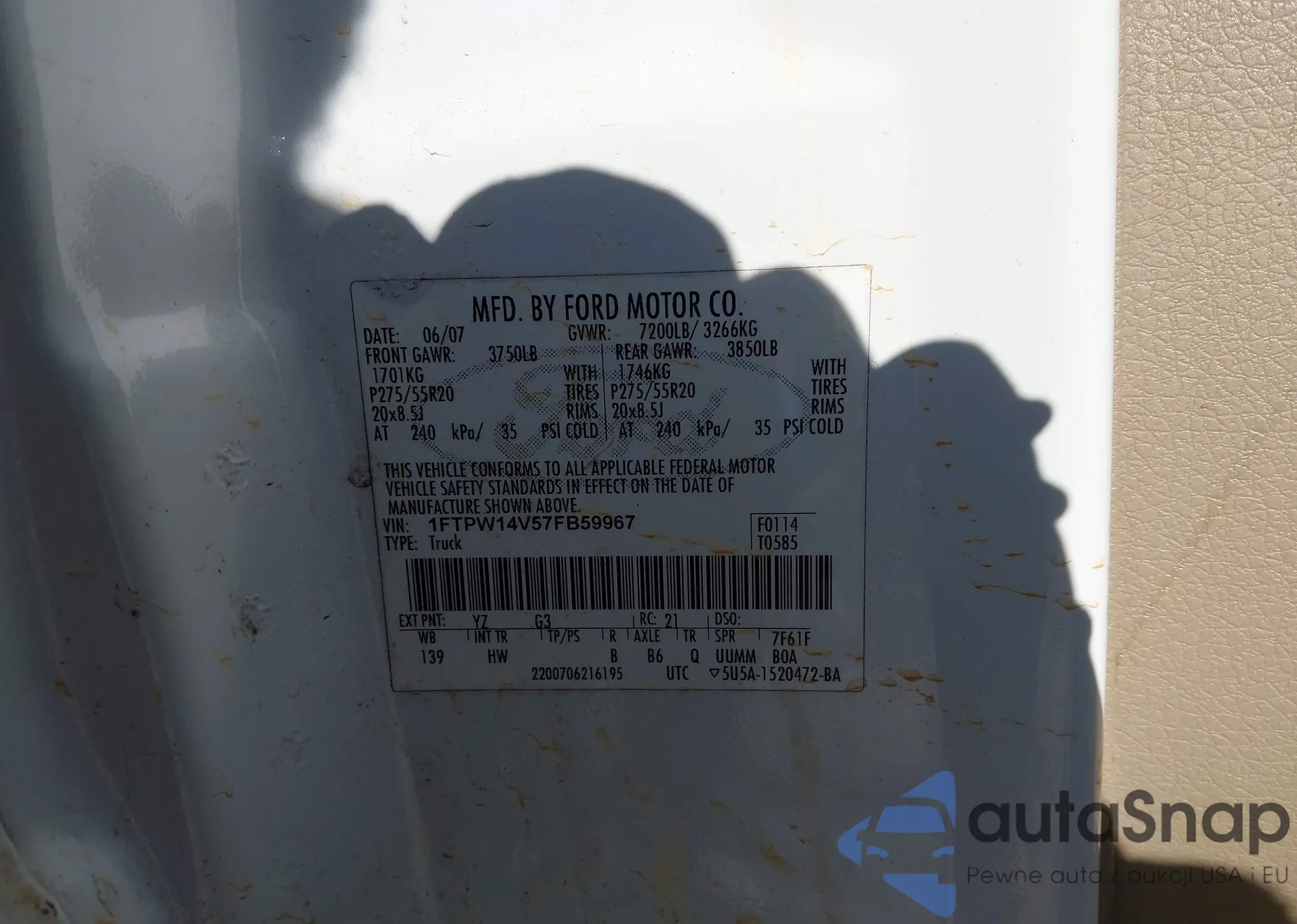 LOT: 44085449 VIN: 1FTPW14V57FB59967