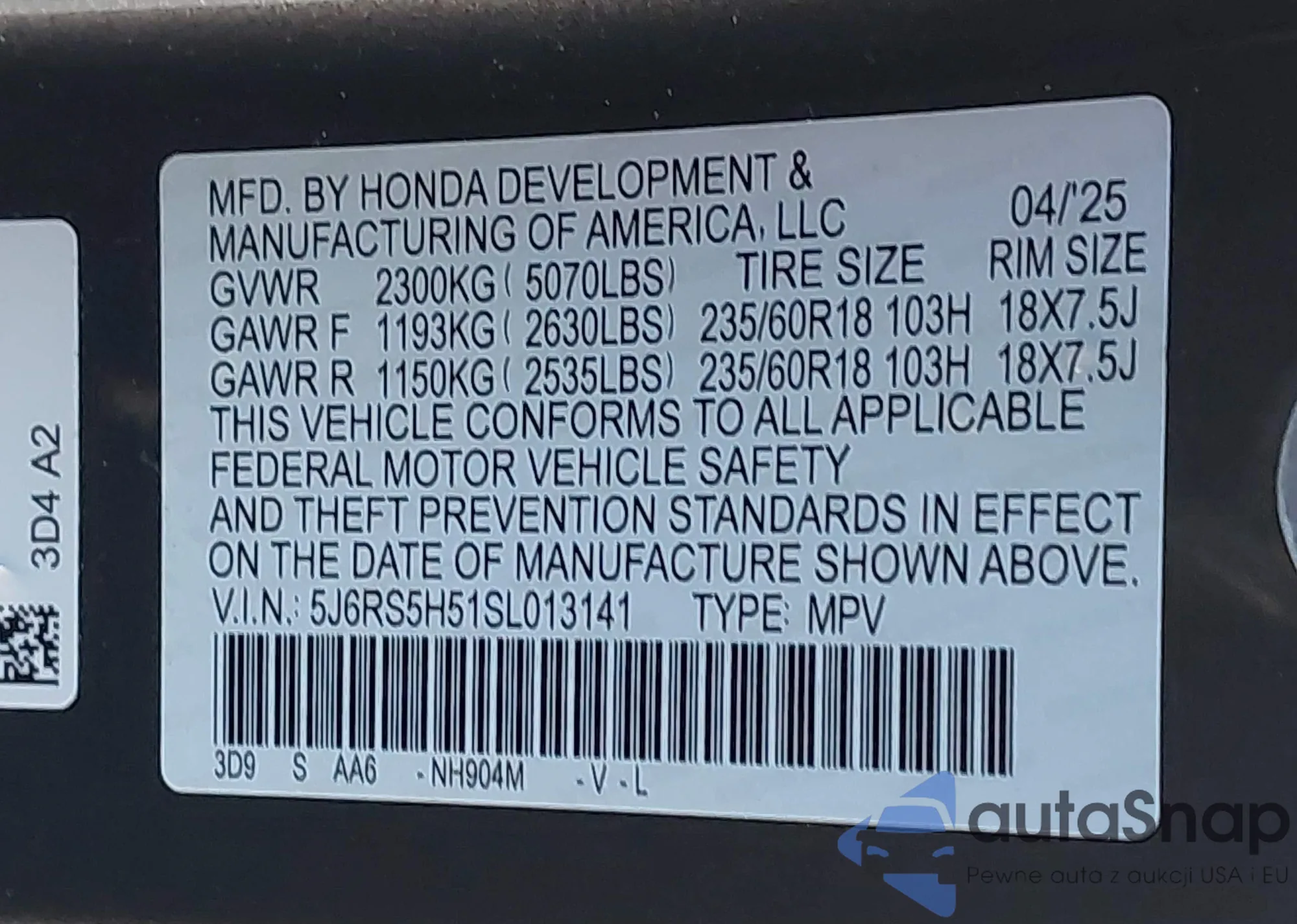• VIN 5J6RS5H51SL013141