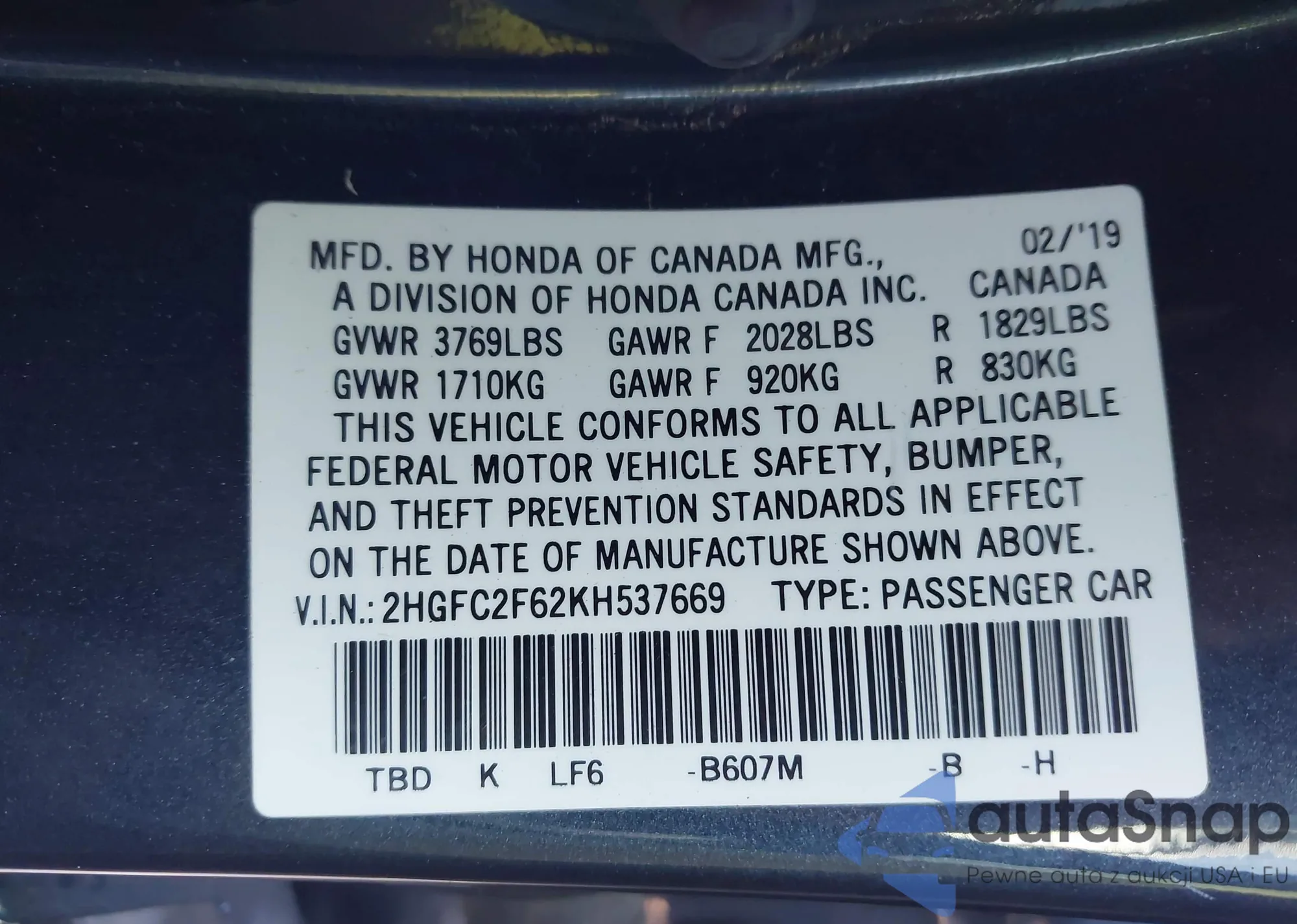 • VIN 2HGFC2F62KH537669