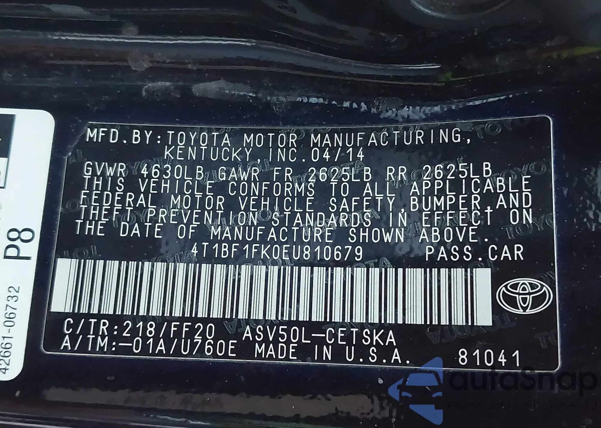 • VIN 4T1BF1FK0EU810679