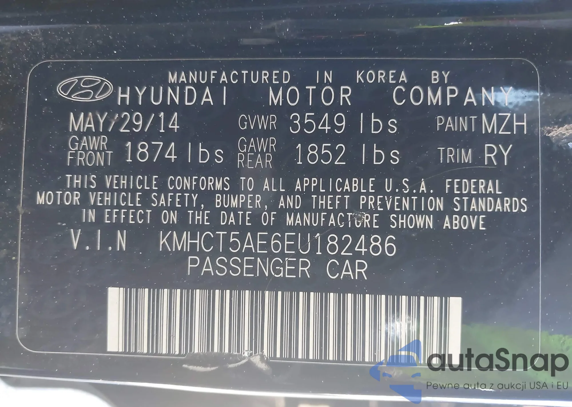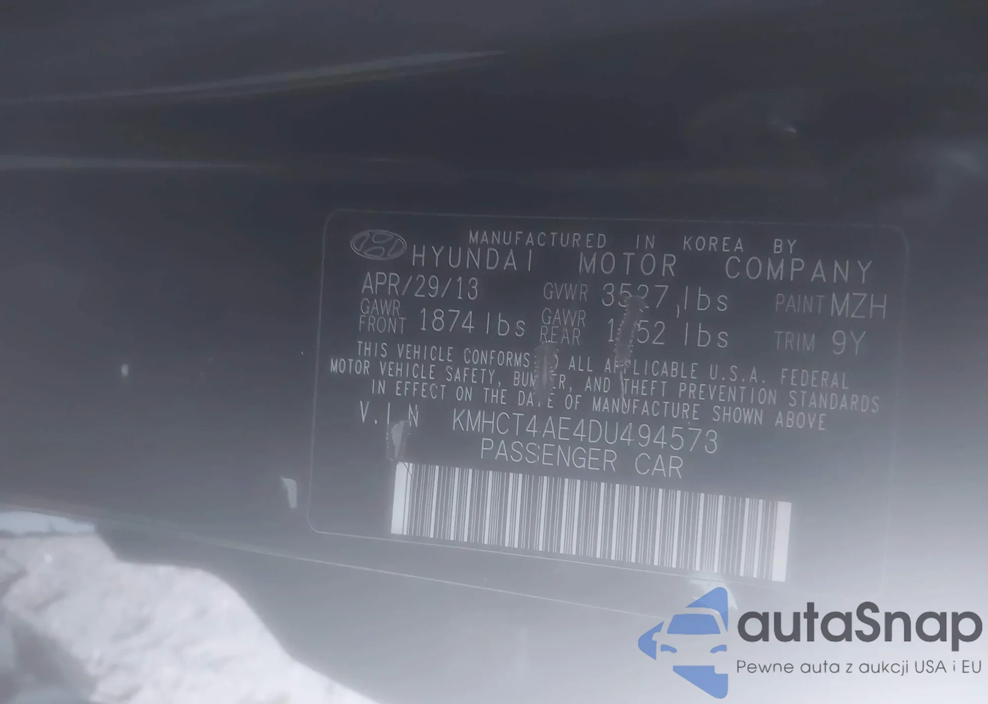 LOT: 43827937 VIN: KMHCT4AE4DU494573
