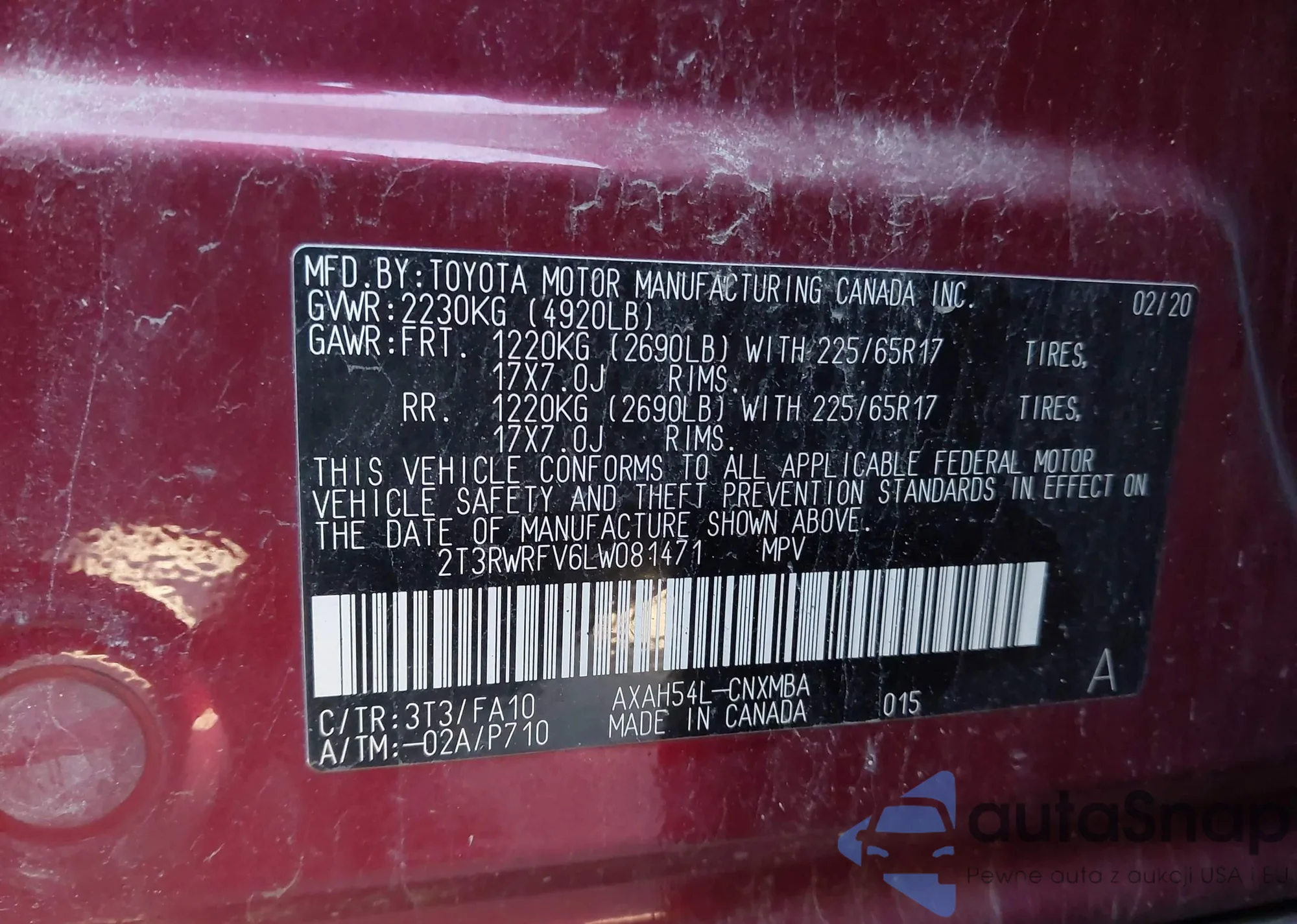 LOT: 43849023 VIN: 2T3RWRFV6LW081471