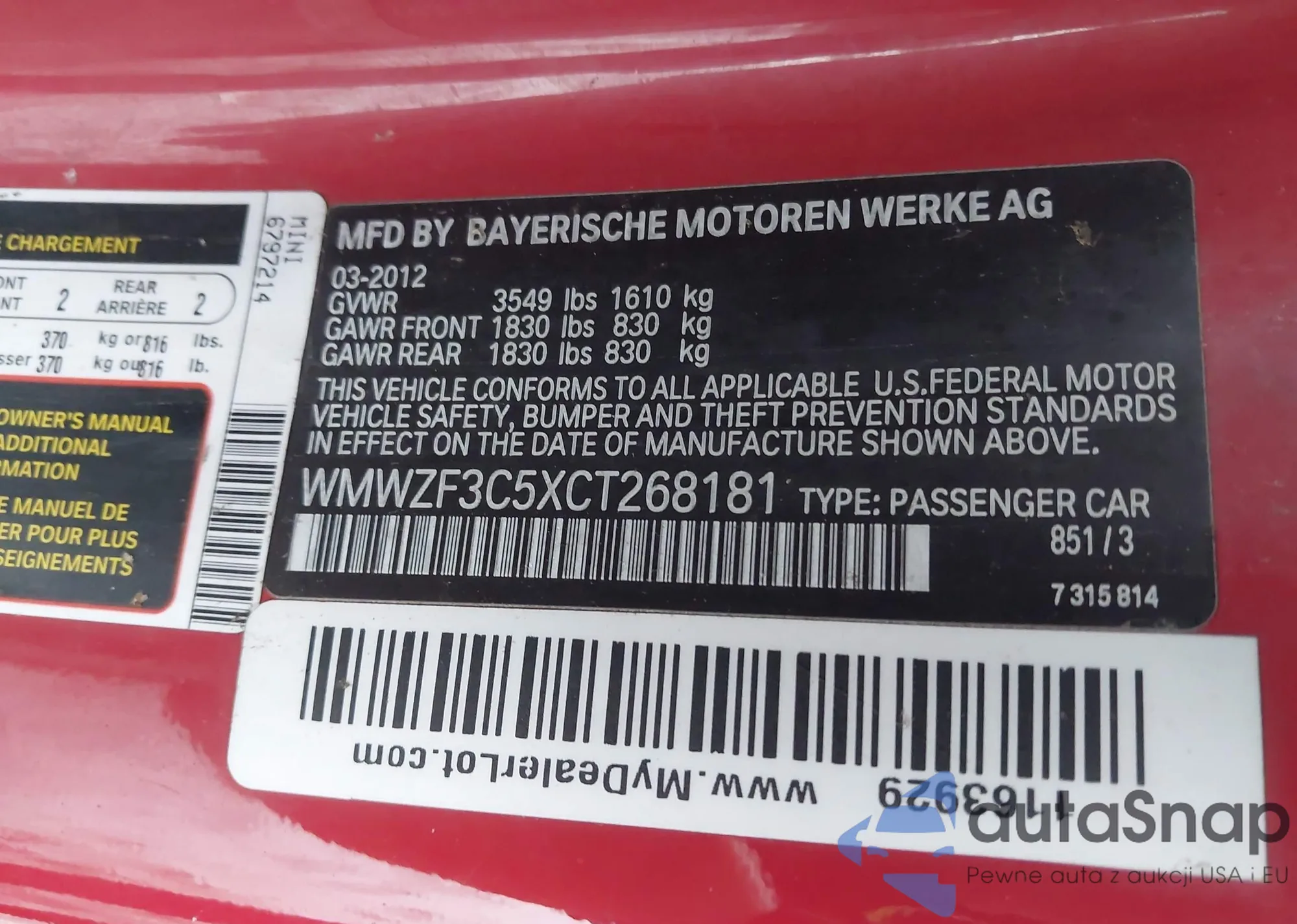 LOT: 44013138 VIN: WMWZF3C5XCT268181