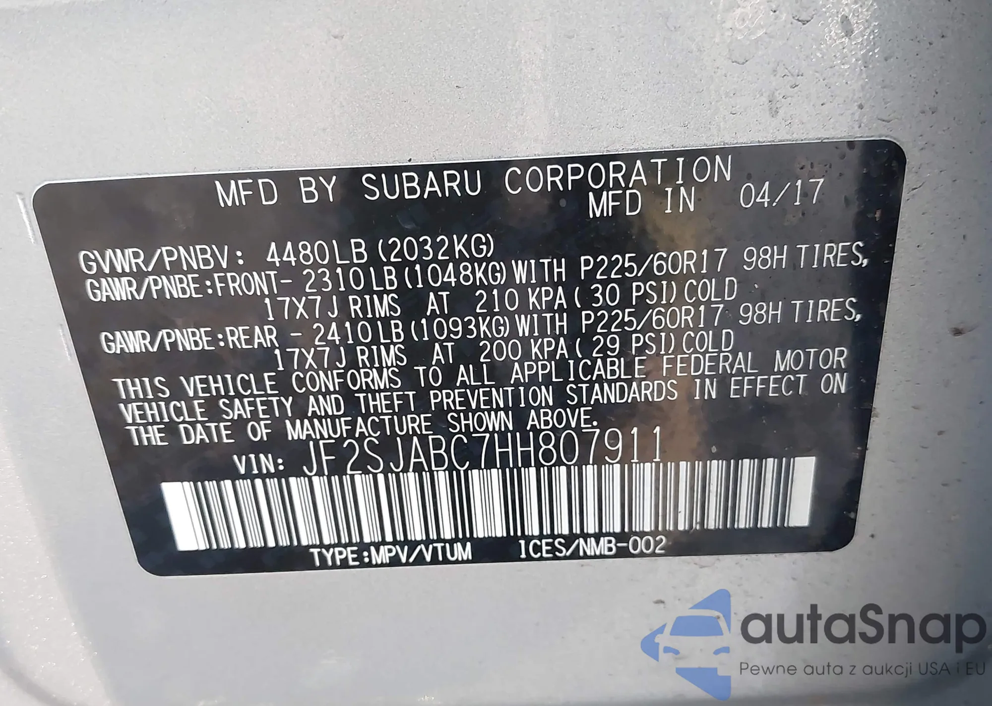LOT: 44040485 VIN: JF2SJABC7HH807911