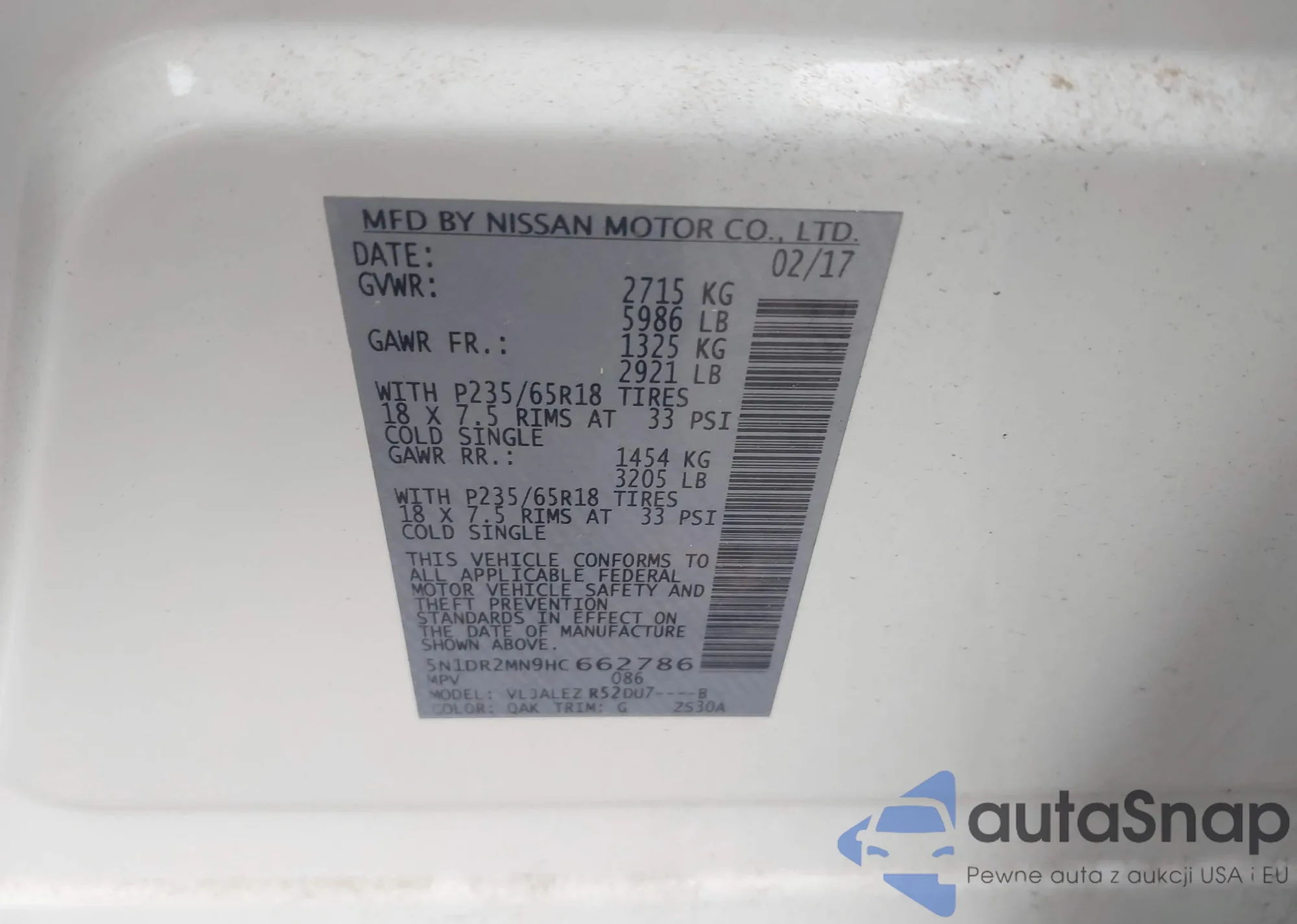 LOT: 44096355 VIN: 5N1DR2MN9HC662786