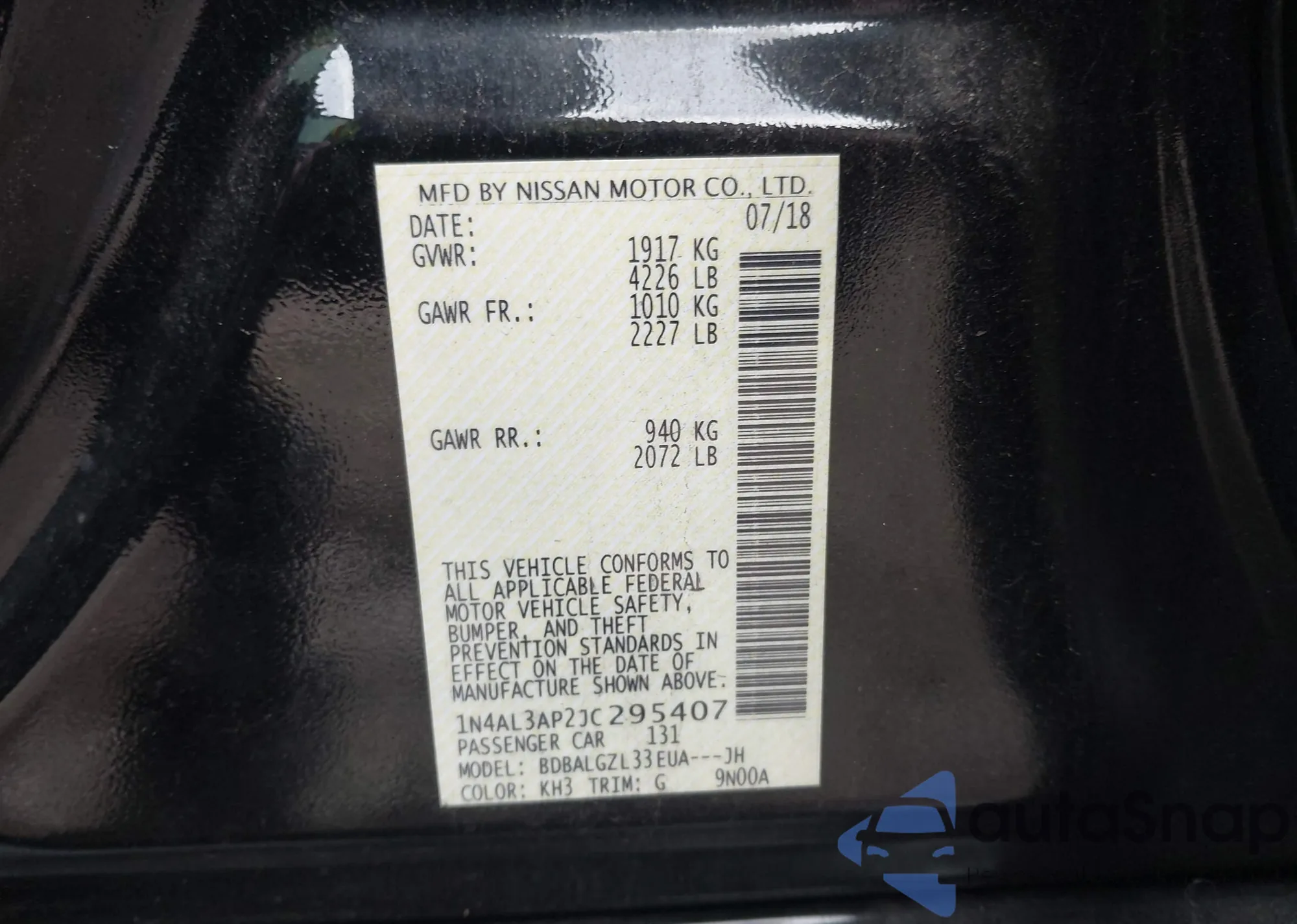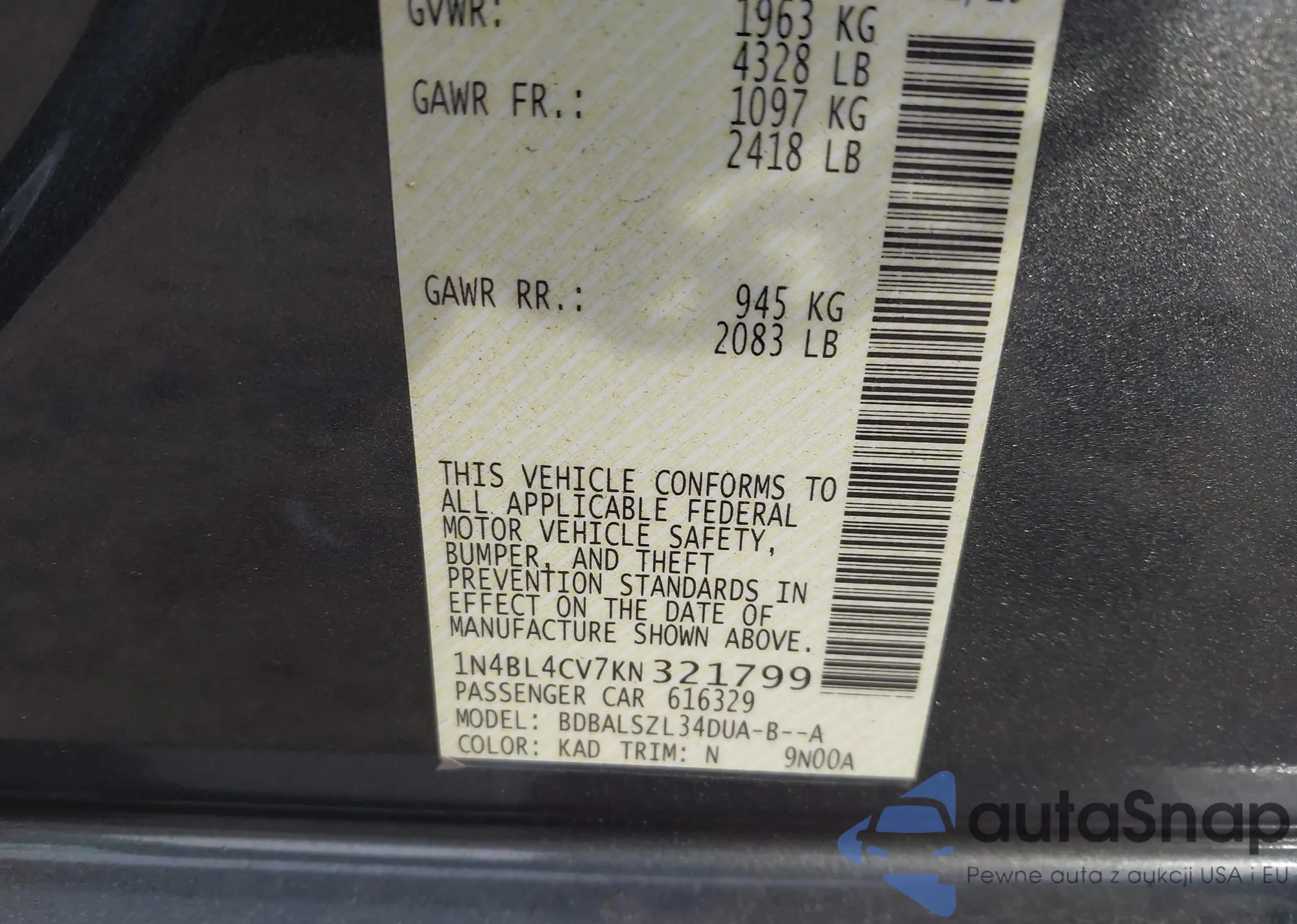 • VIN 1N4BL4CV7KN321799
