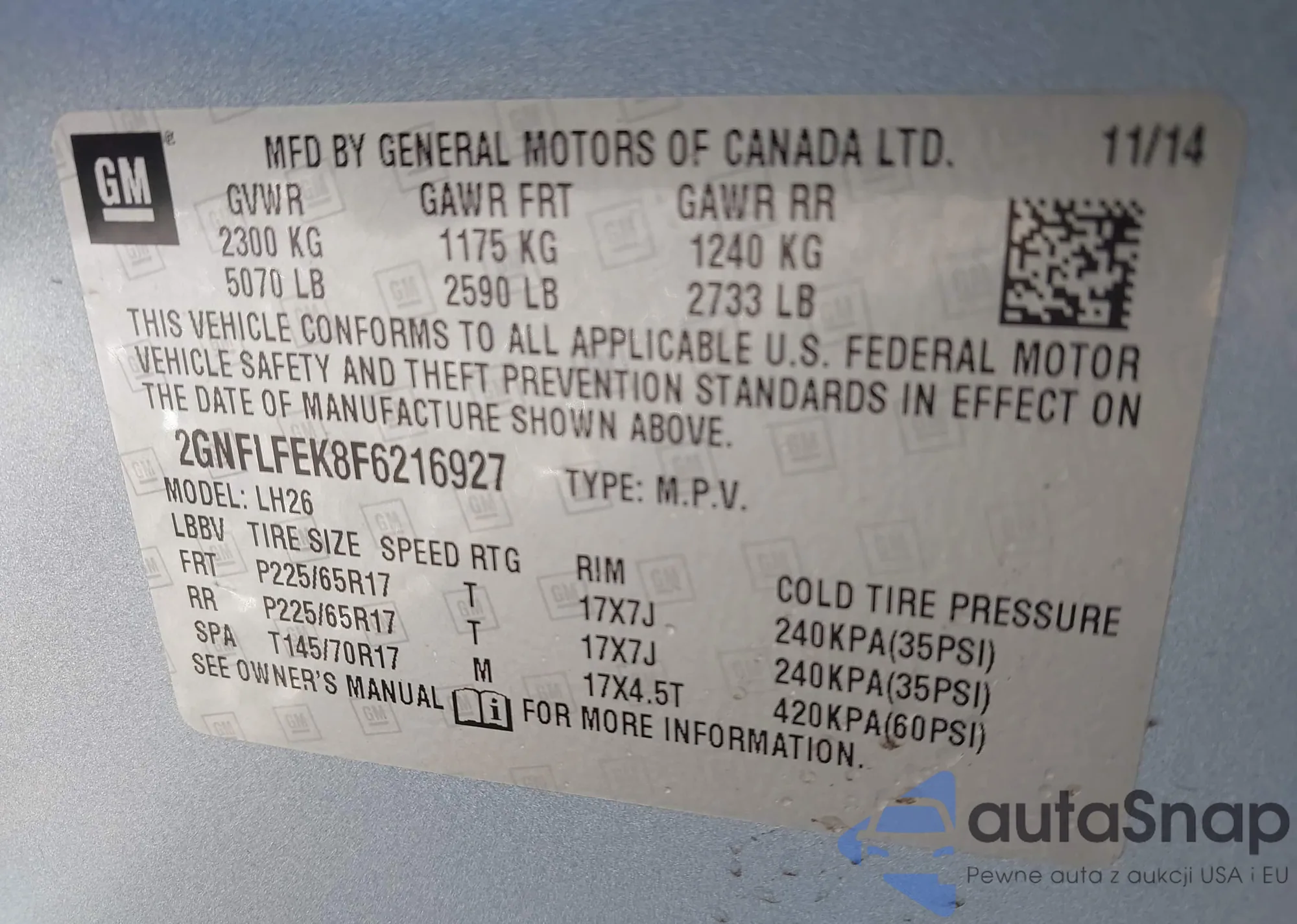 • VIN 2GNFLFEK8F6216927
