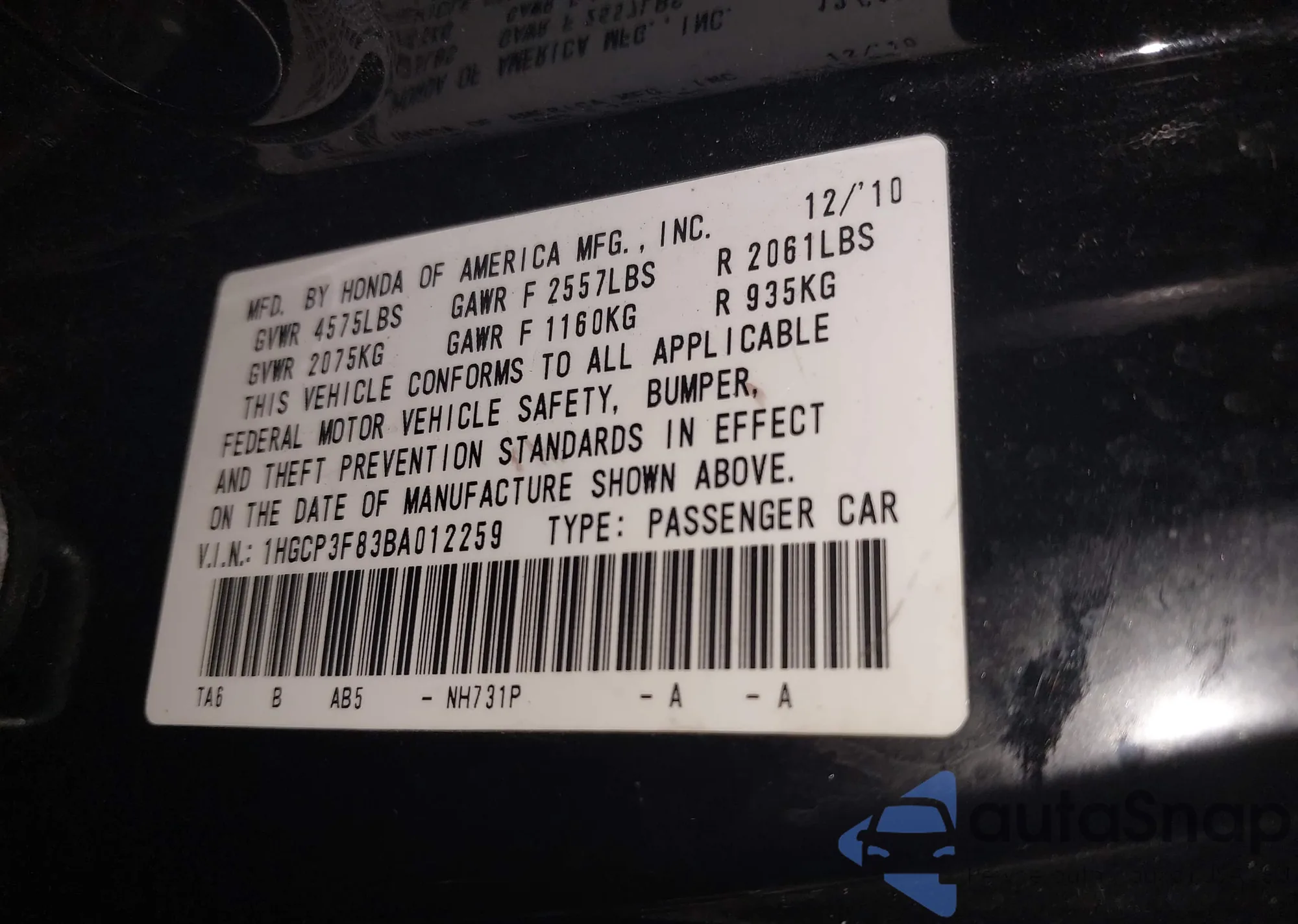 LOT: 43868038 VIN: 1HGCP3F83BA012259