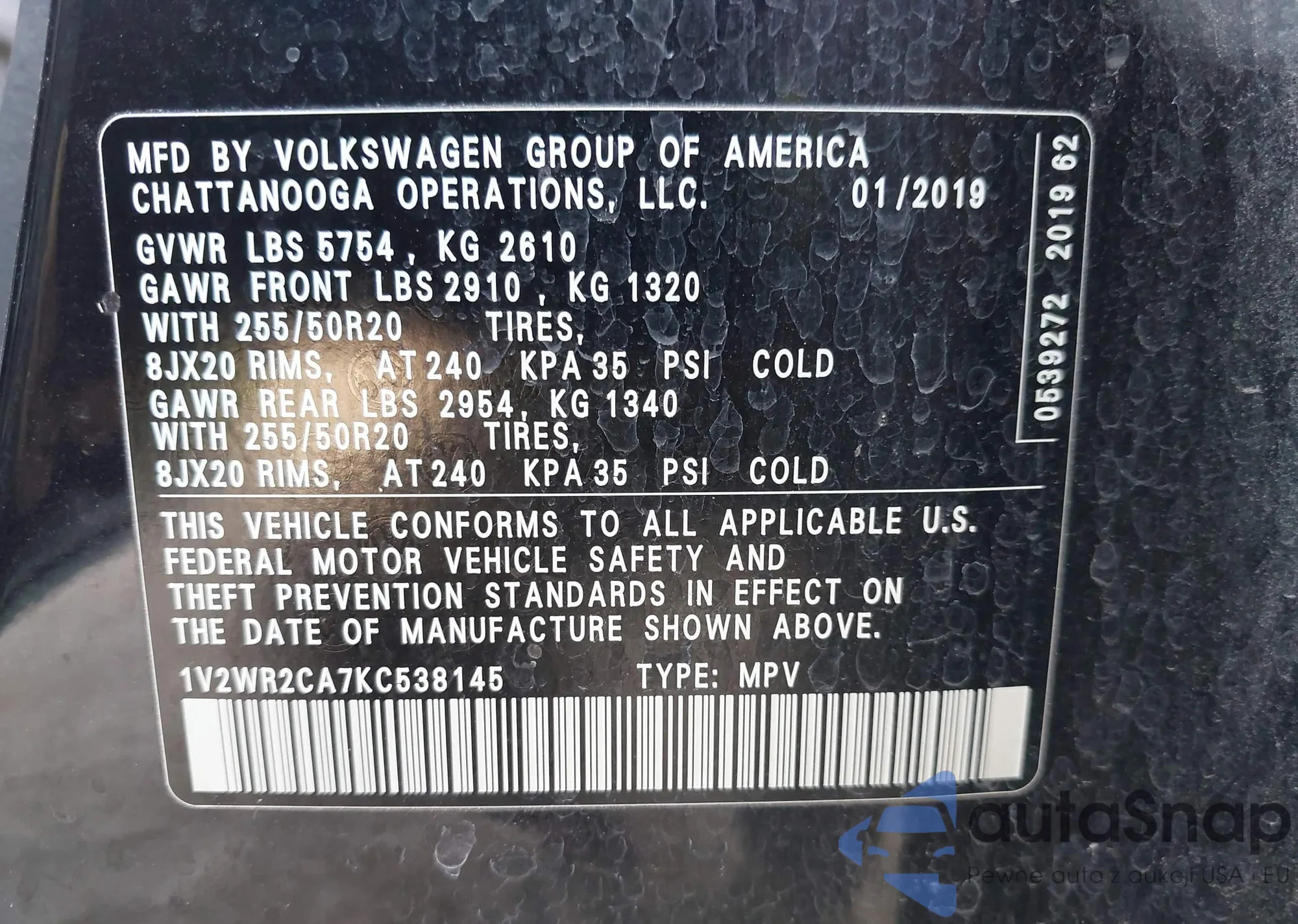 LOT: 43644872 VIN: 1V2WR2CA7KC538145