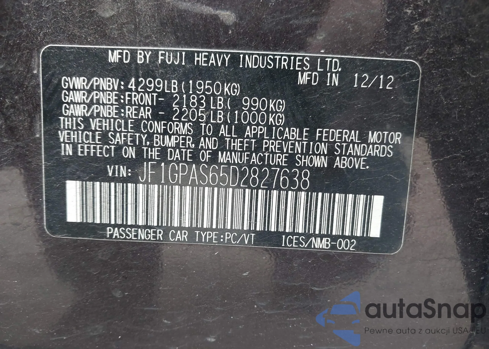 LOT: 44087373 VIN: JF1GPAS65D2827638