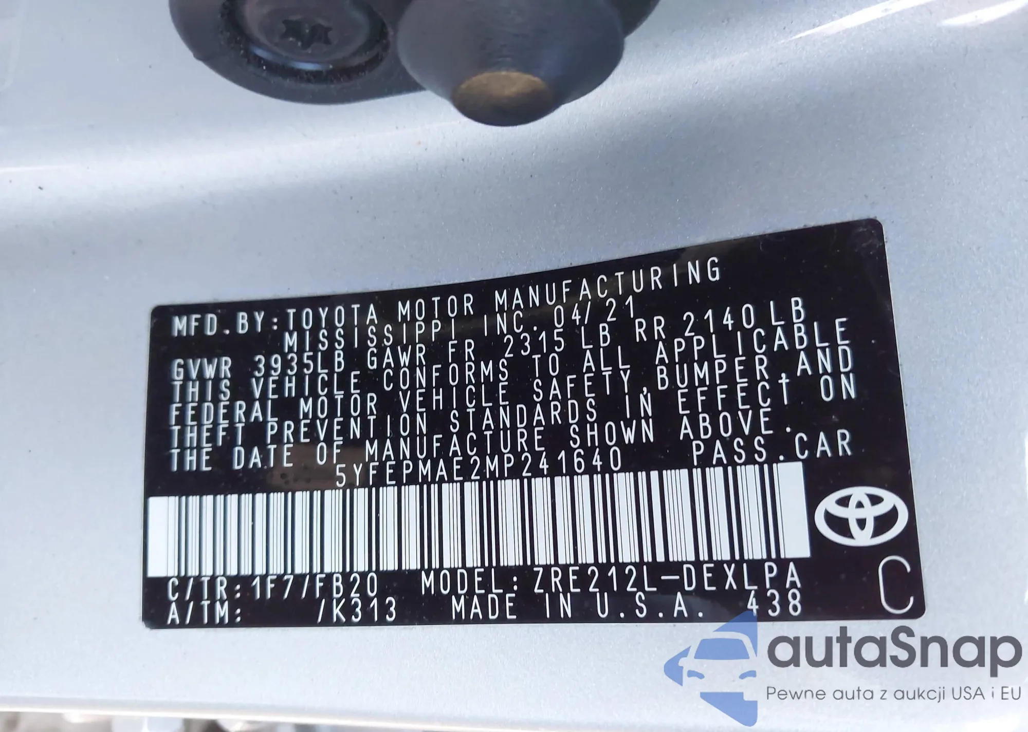 LOT: 43691007 VIN: 5YFEPMAE2MP241640