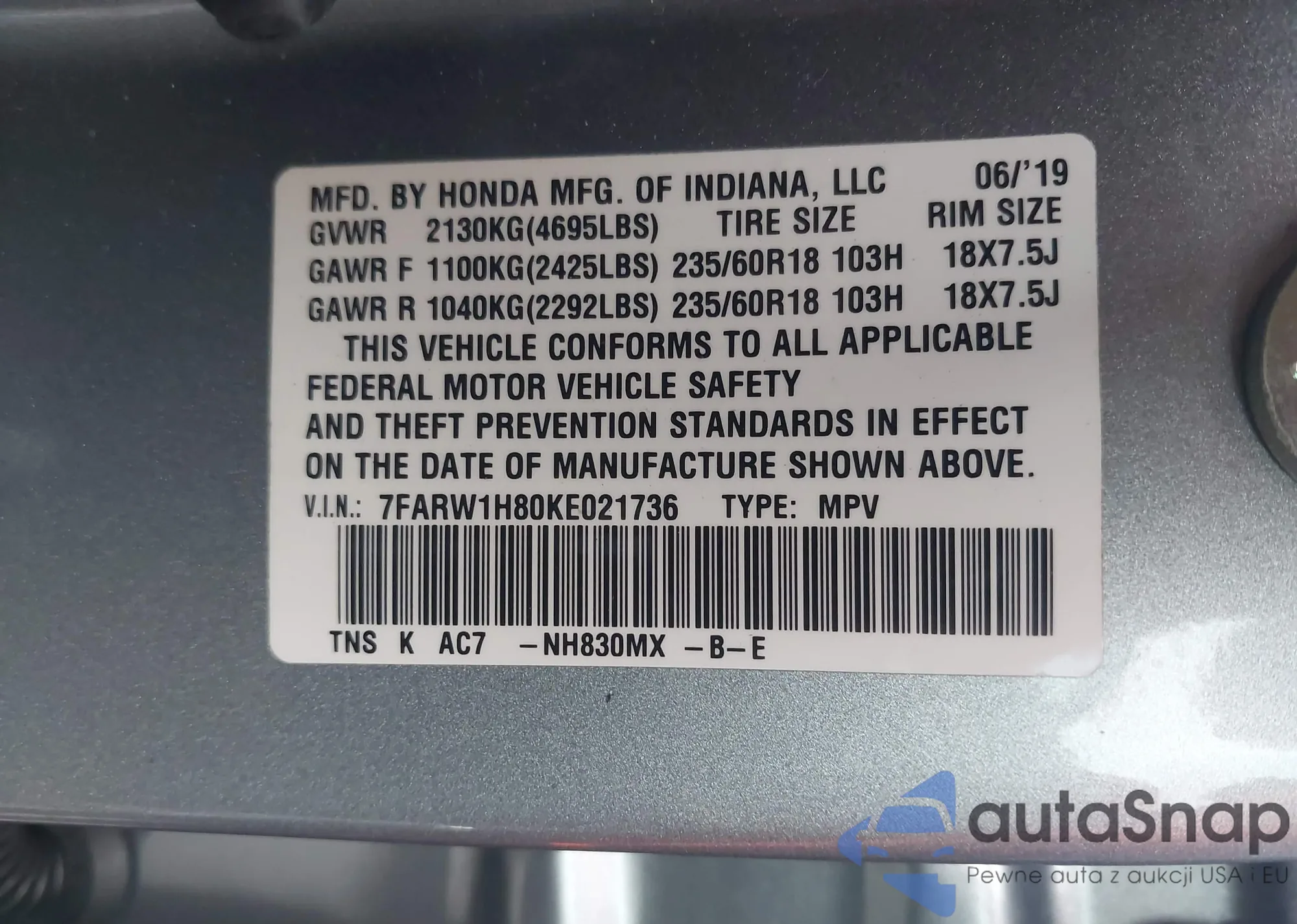 • VIN 7FARW1H80KE021736