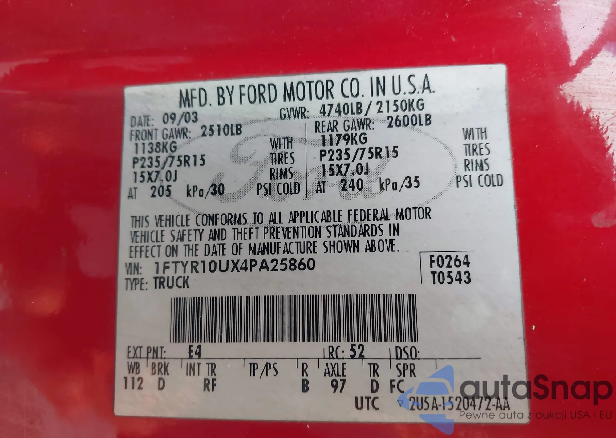 • VIN 1FTYR10UX4PA25860