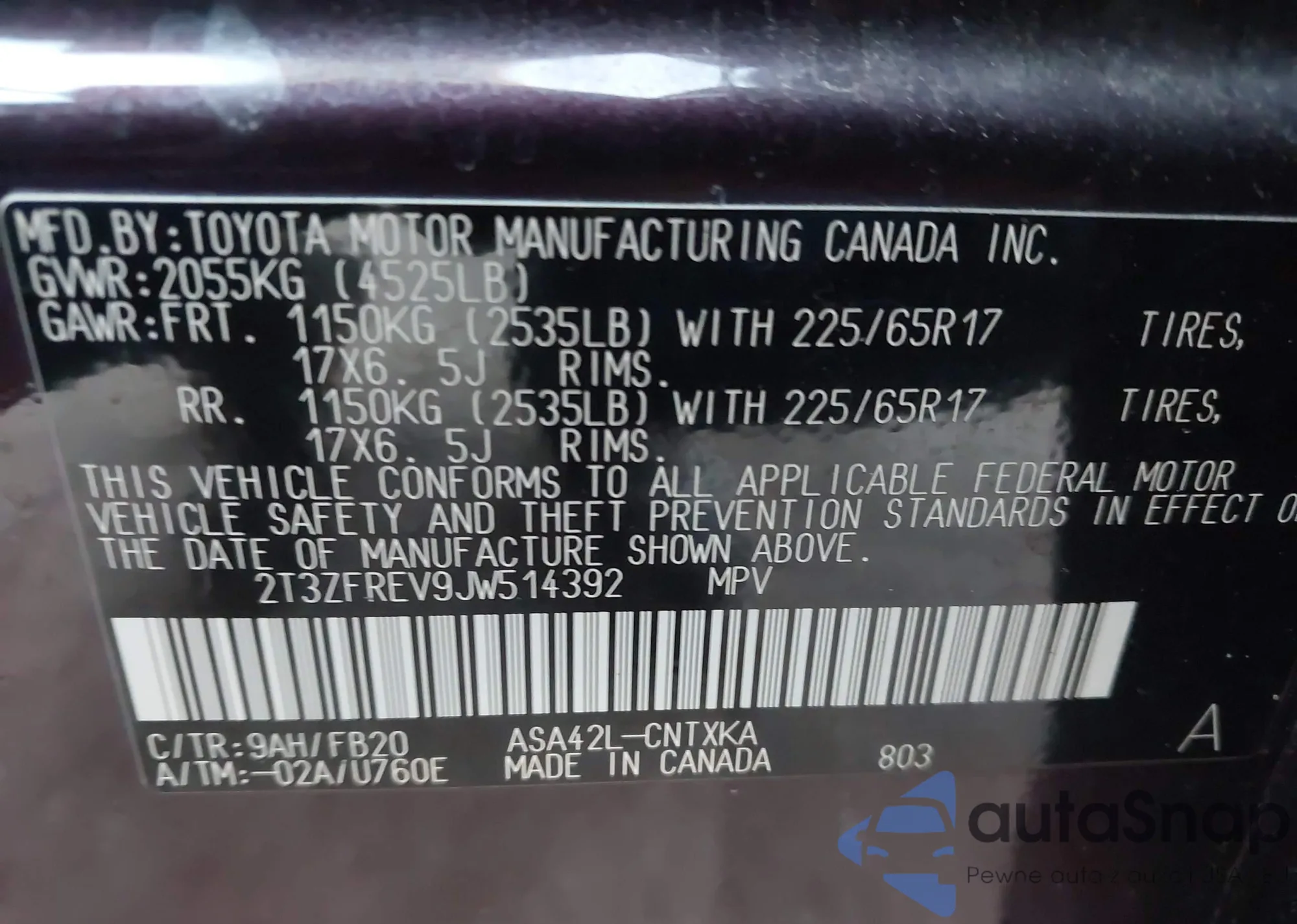• VIN 2T3ZFREV9JW514392