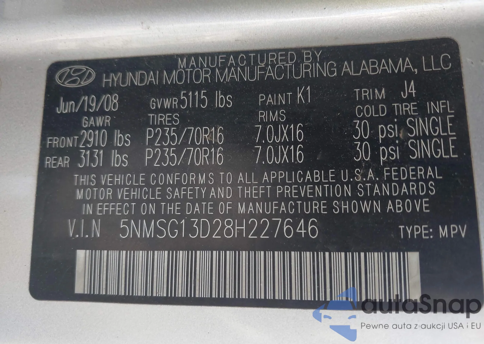 LOT: 43627679 VIN: 5NMSG13D28H227646