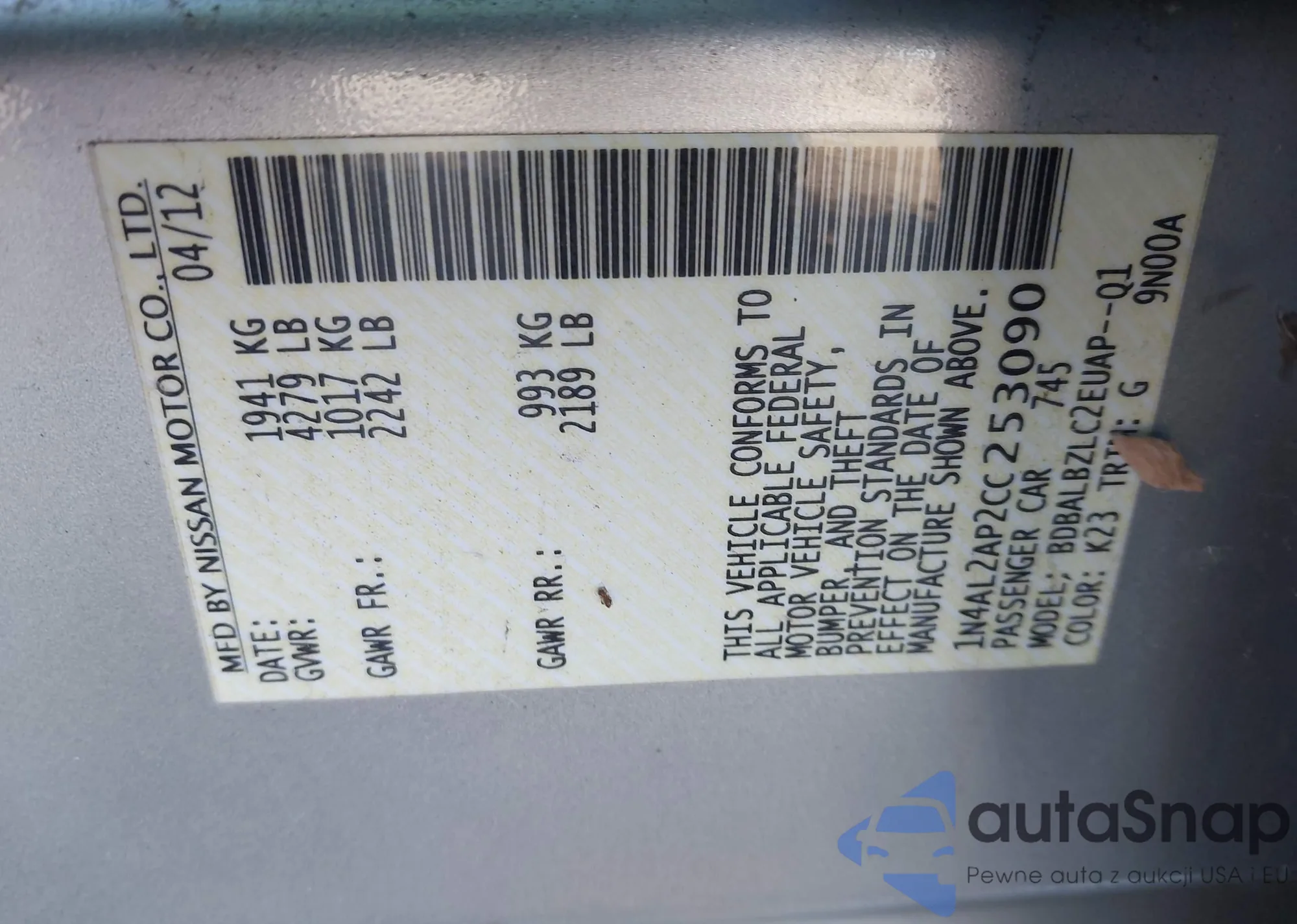 LOT: 43556567 VIN: 1N4AL2AP2CC253090