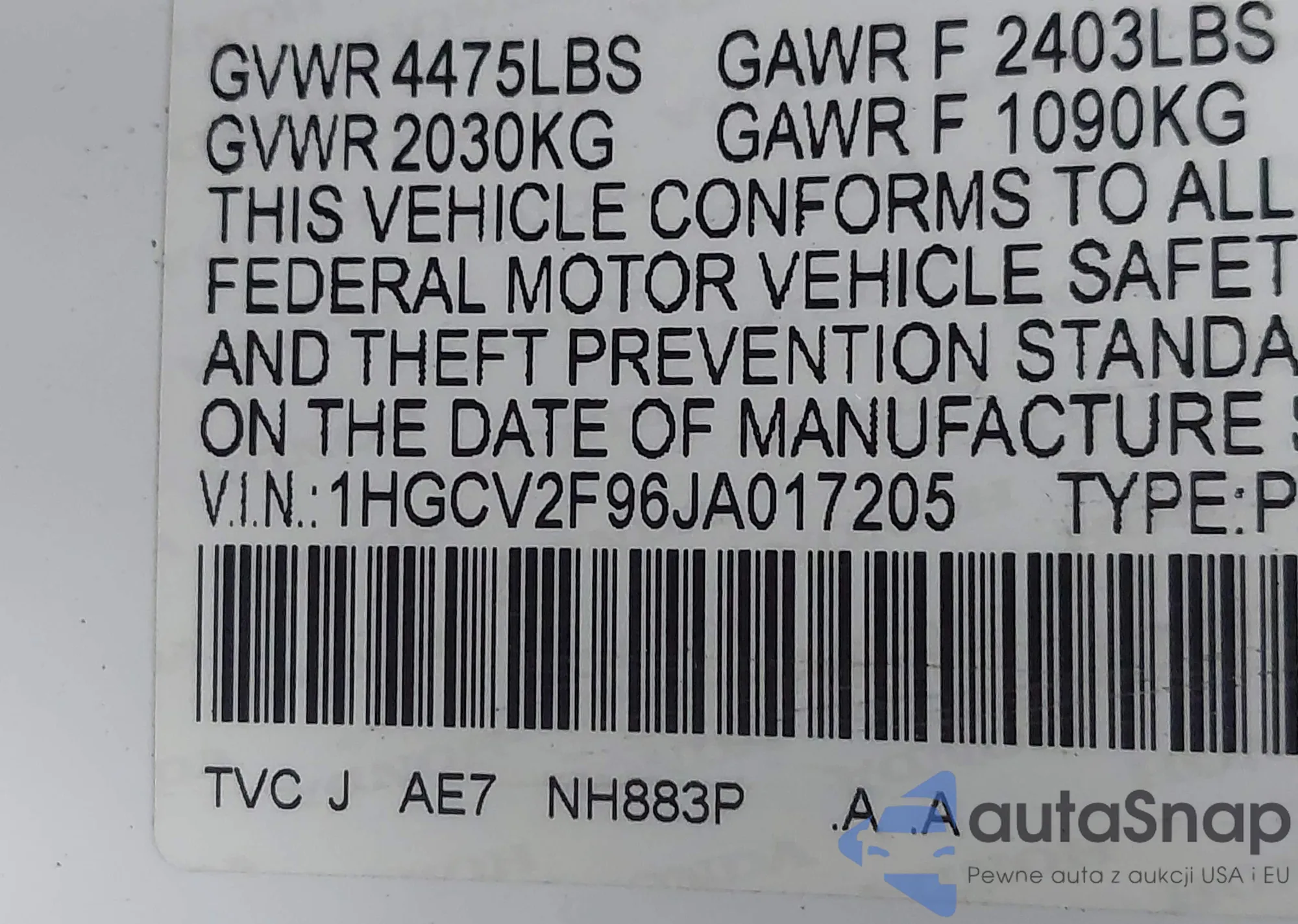 • VIN 1HGCV2F96JA017205
