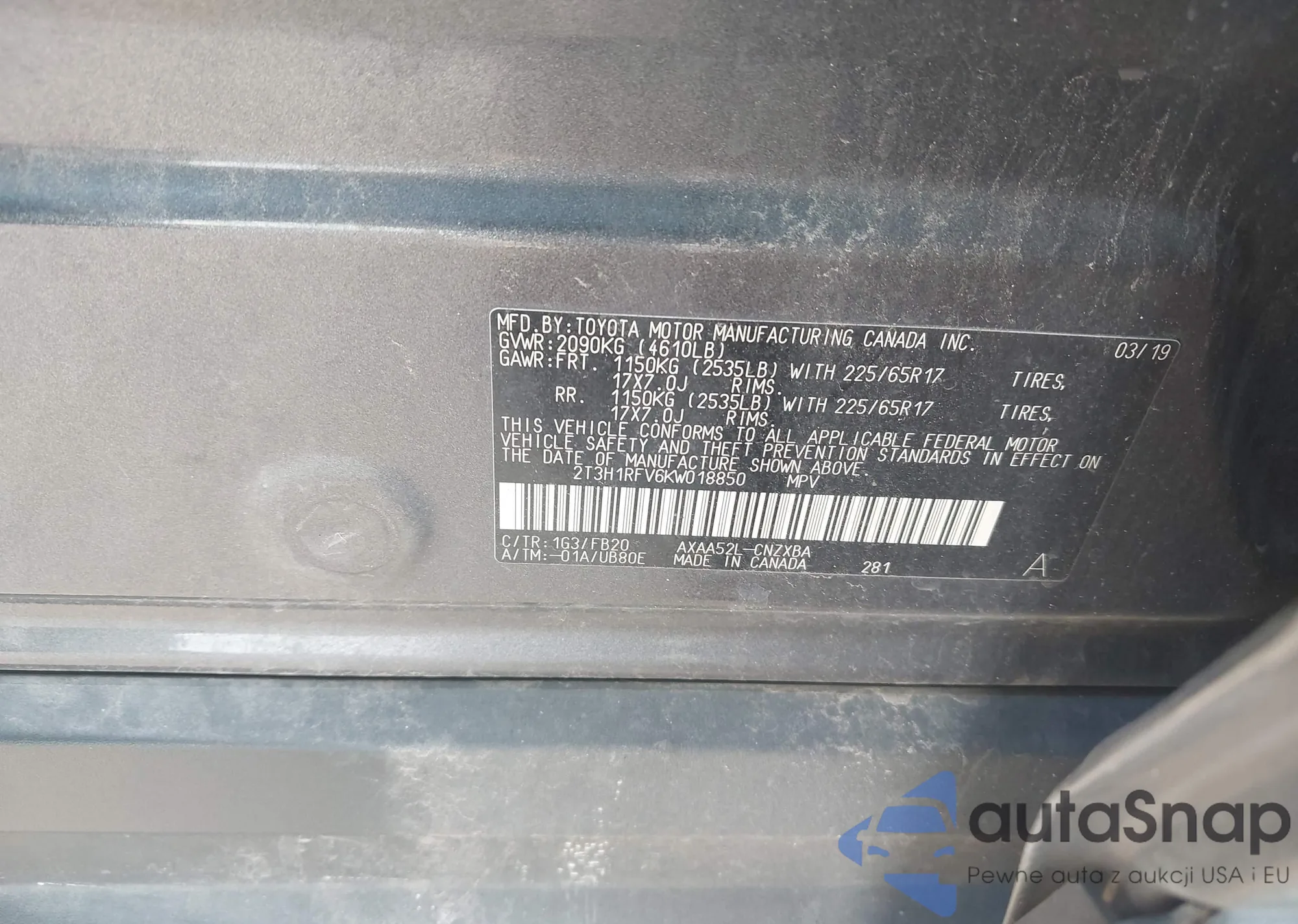 • VIN 2T3H1RFV6KW018850