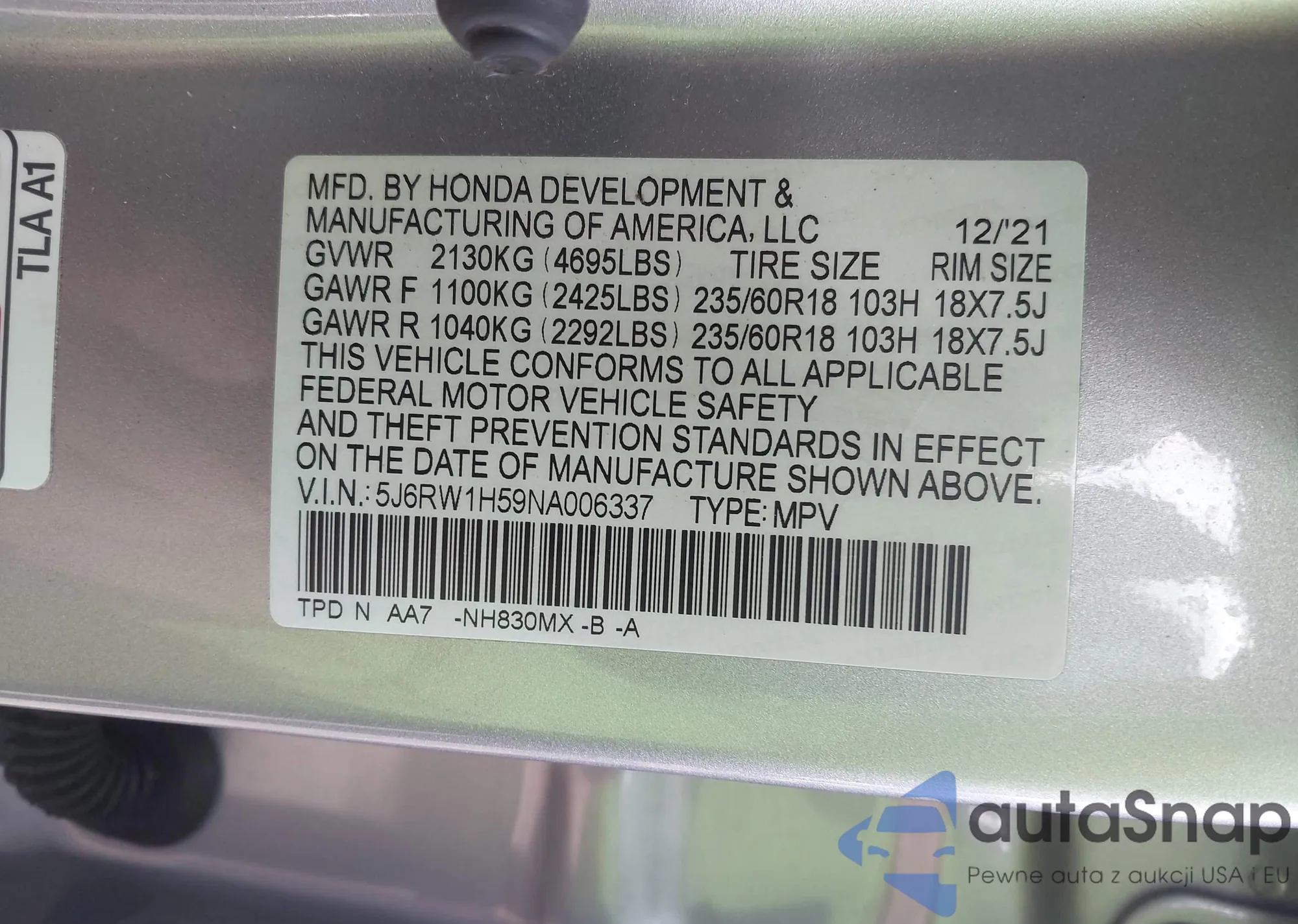 • VIN 5J6RW1H59NA006337