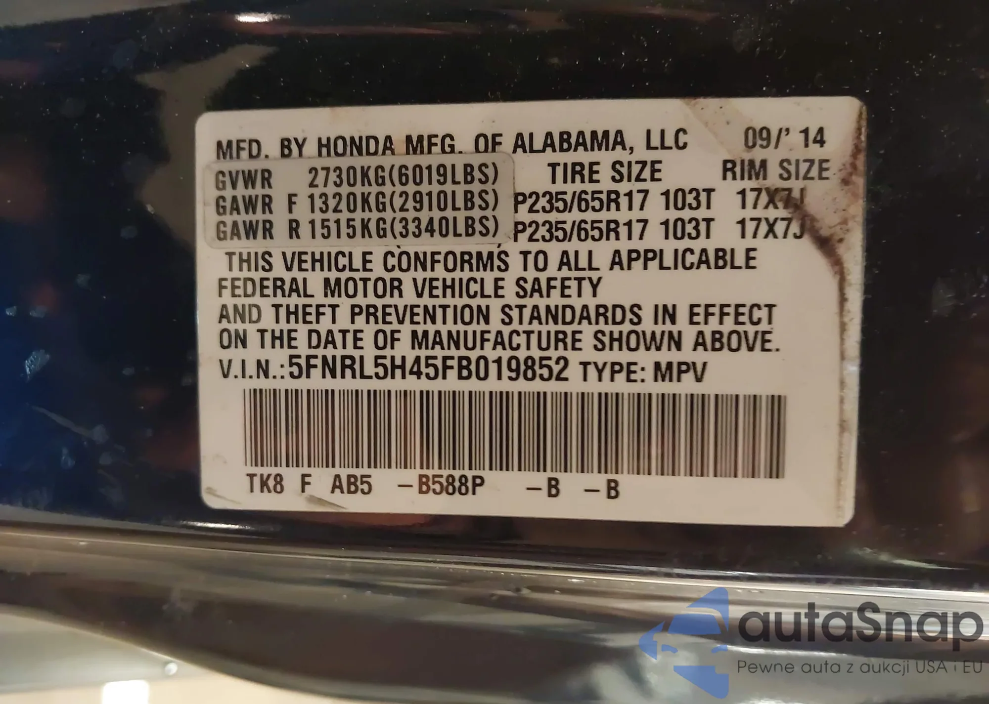 • VIN 5FNRL5H45FB019852