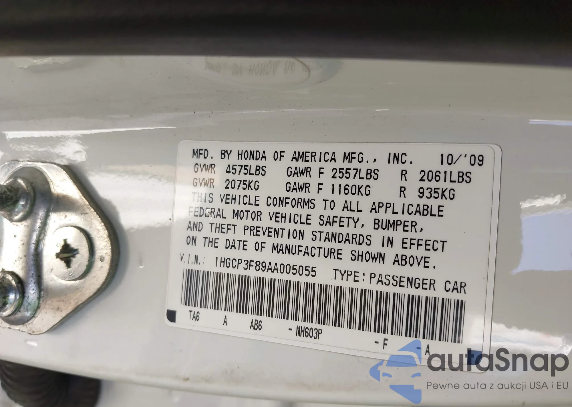 LOT: 43799804 VIN: 1HGCP3F89AA005055