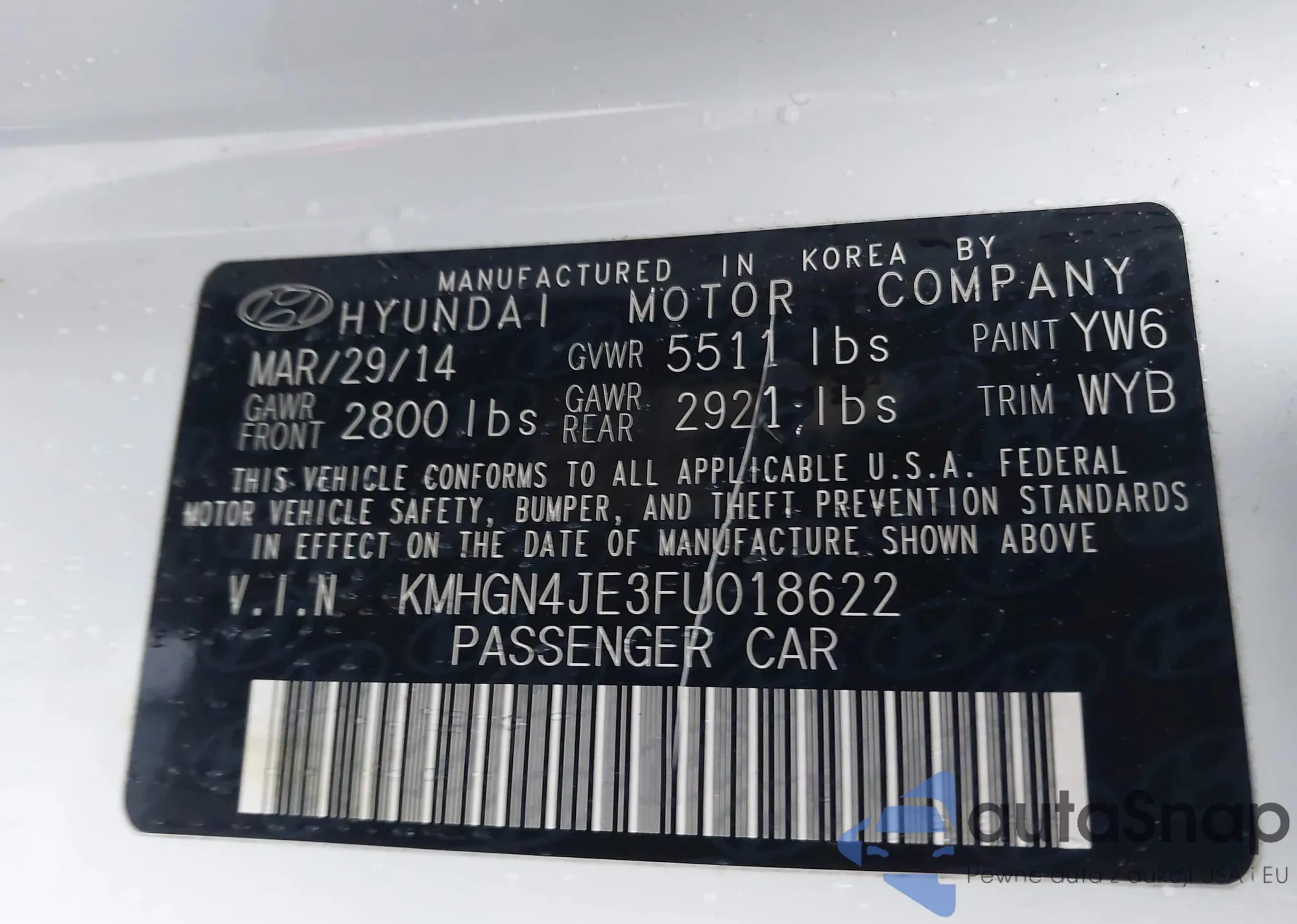 LOT: 43801467 VIN: KMHGN4JE3FU018622