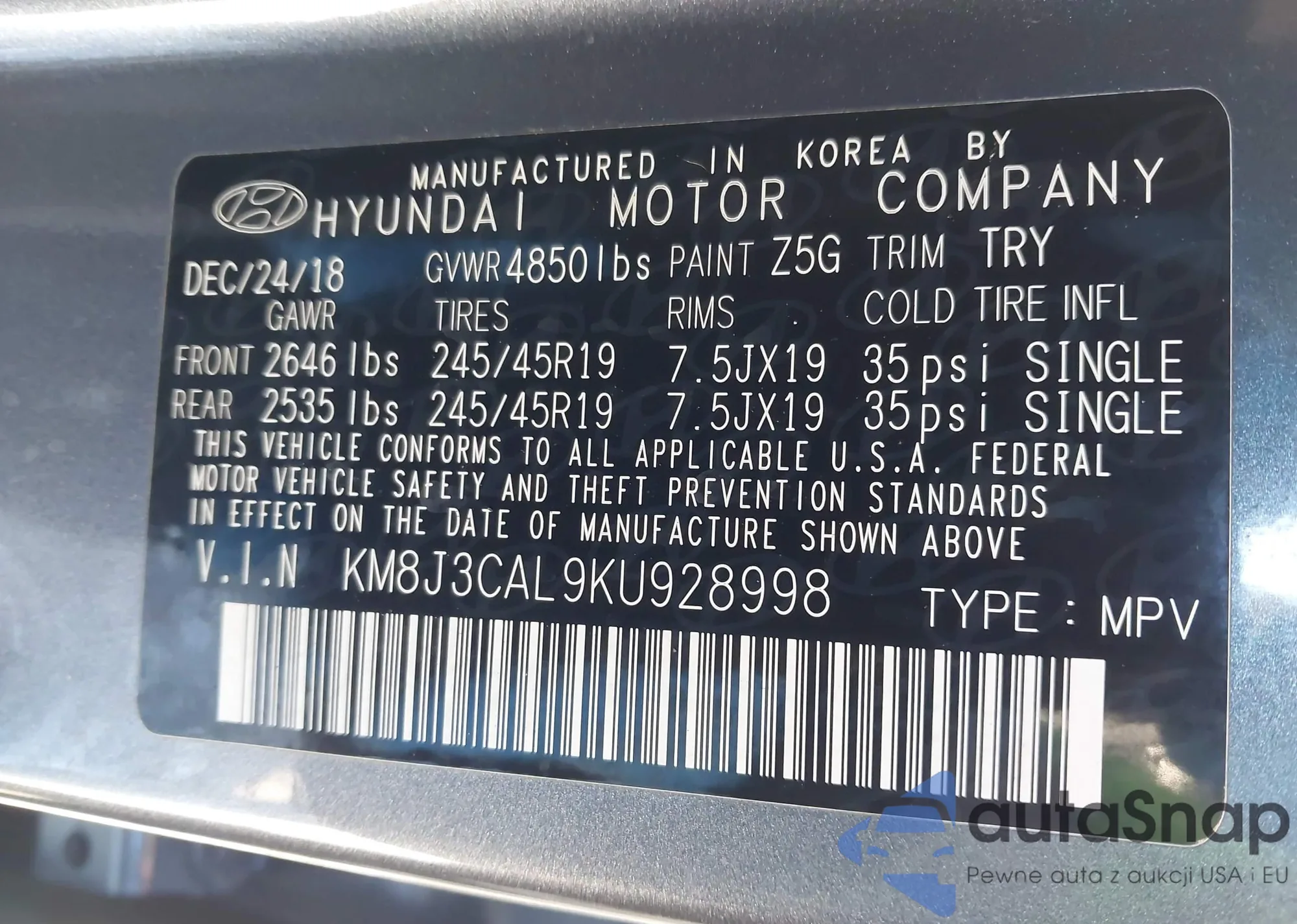 • VIN KM8J3CAL9KU928998