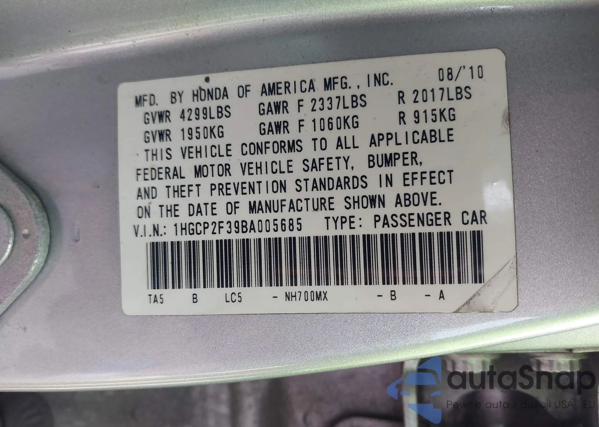 LOT: 43960641 VIN: 1HGCP2F39BA005685