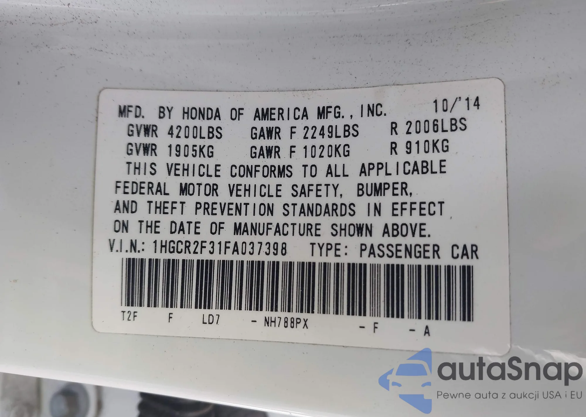• VIN 1HGCR2F31FA037398