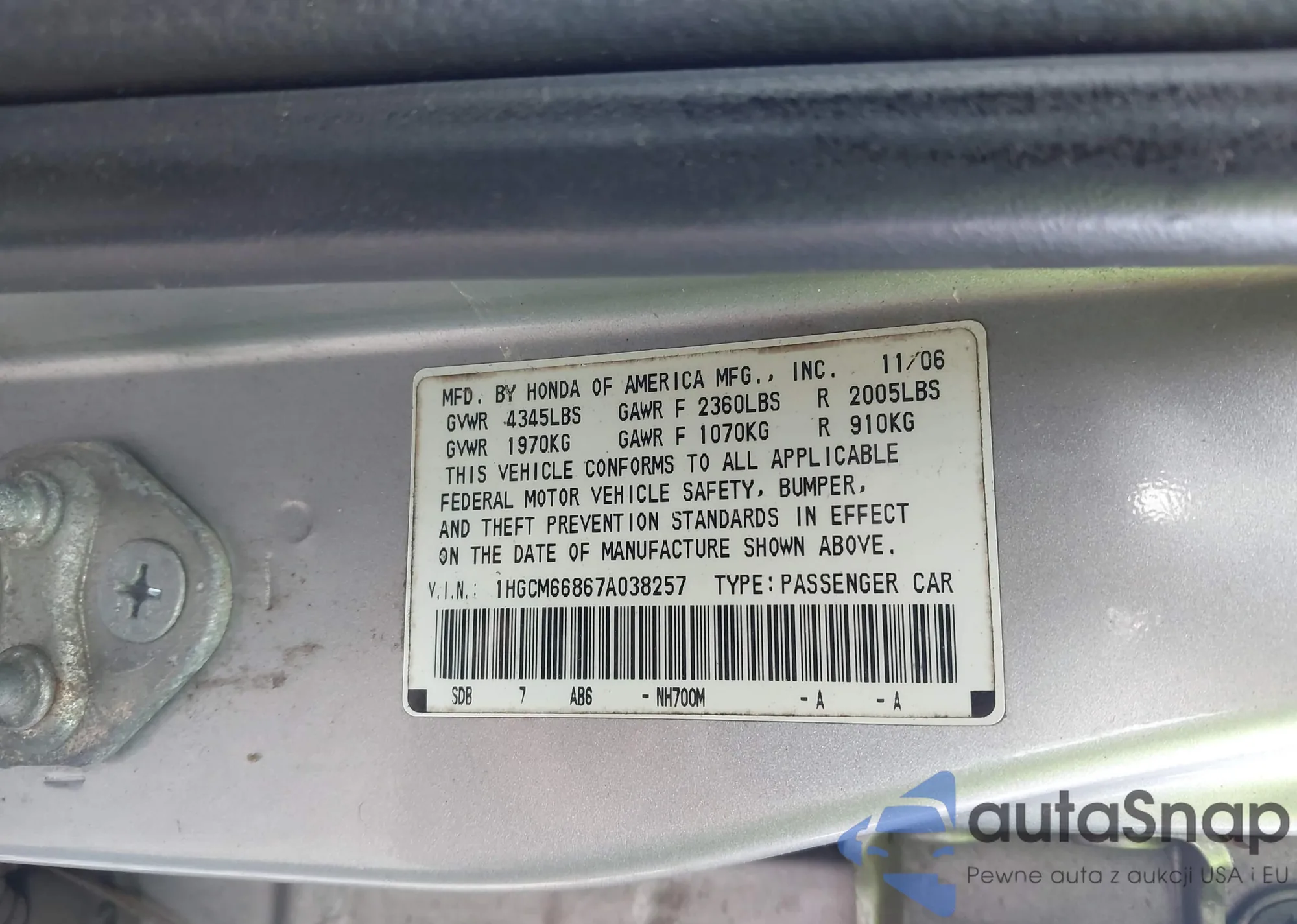 LOT: 43788204 VIN: 1HGCM66867A038257