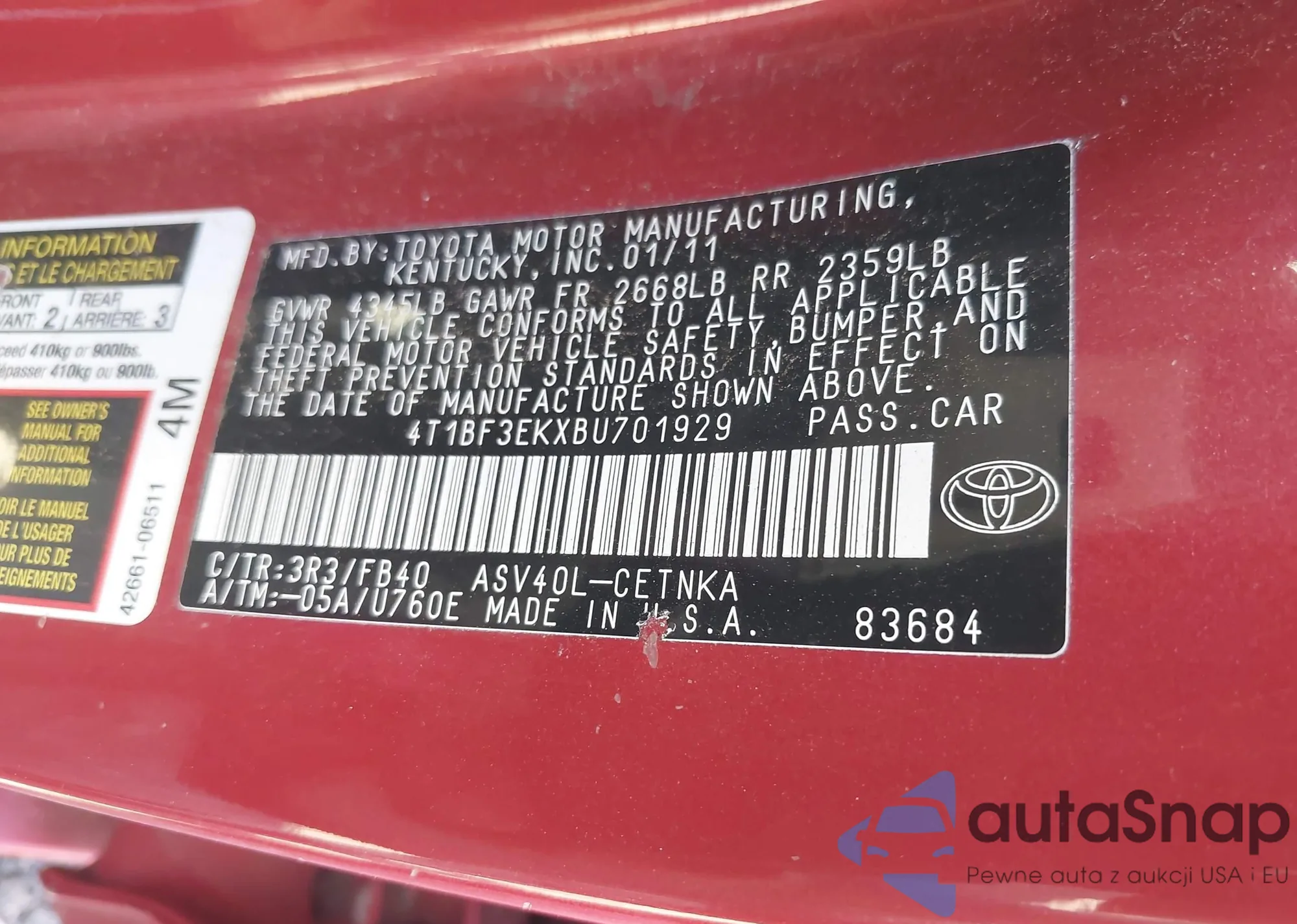 LOT: 43452749 VIN: 4T1BF3EKXBU701929