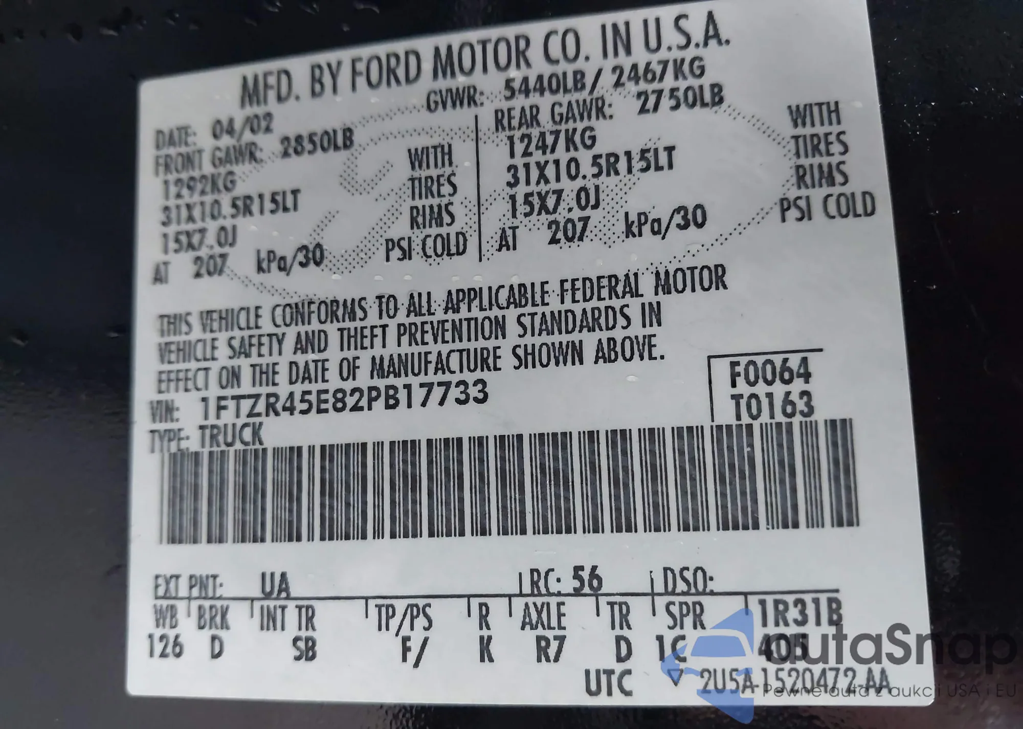 LOT: 43627733 VIN: 1FTZR45E82PB17733