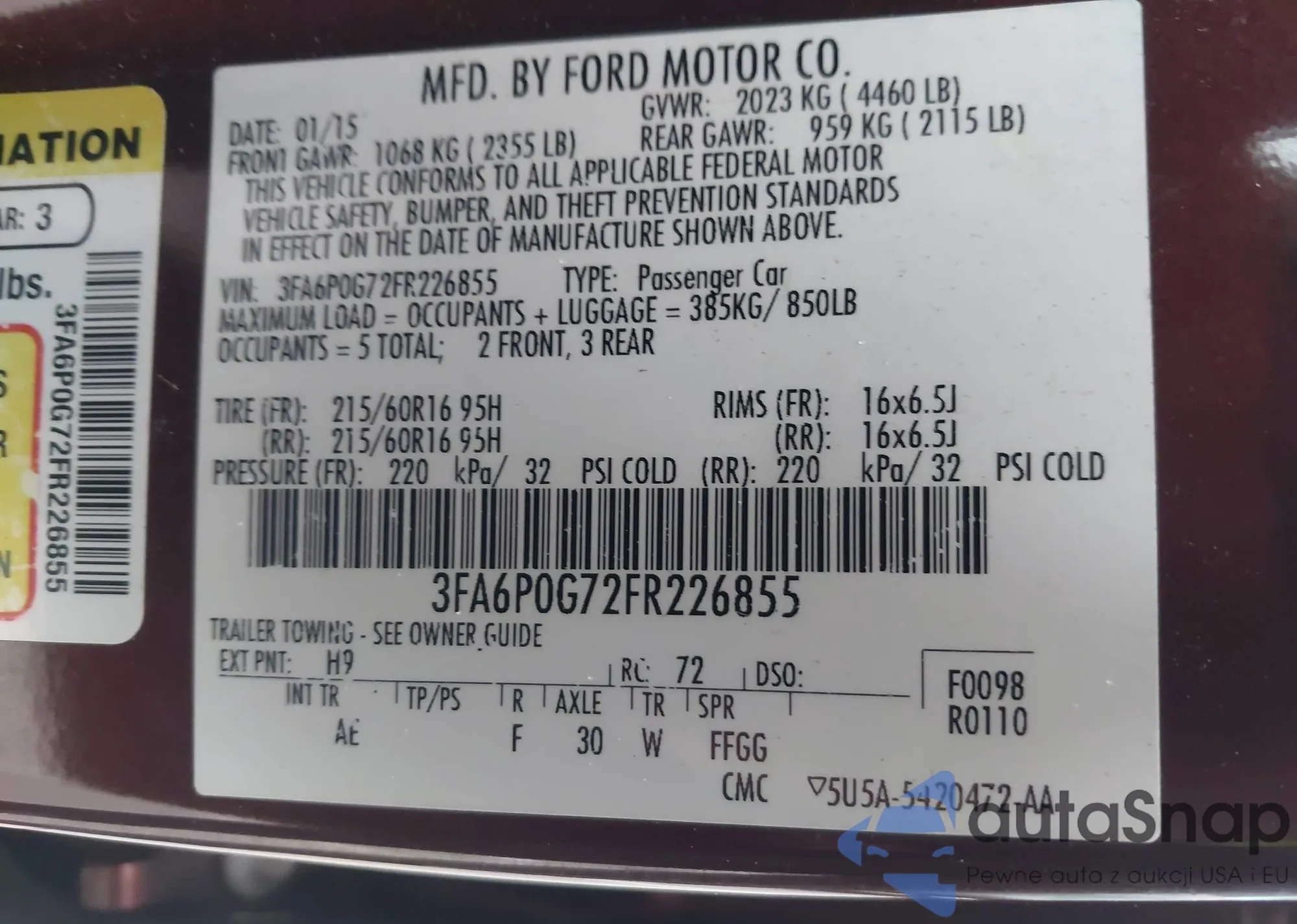LOT: 43921251 VIN: 3FA6P0G72FR226855