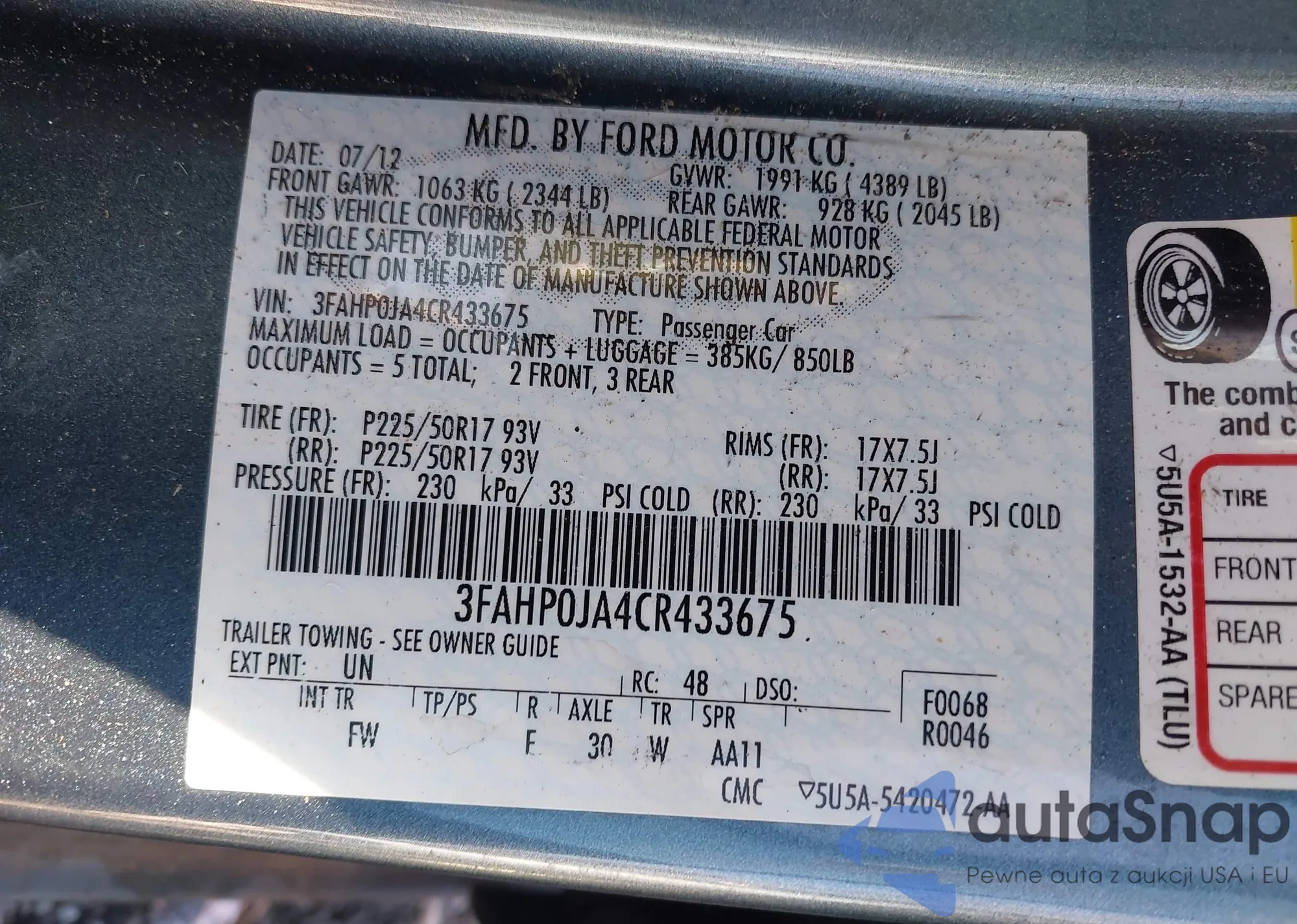 LOT: 43671671 VIN: 3FAHP0JA4CR433675