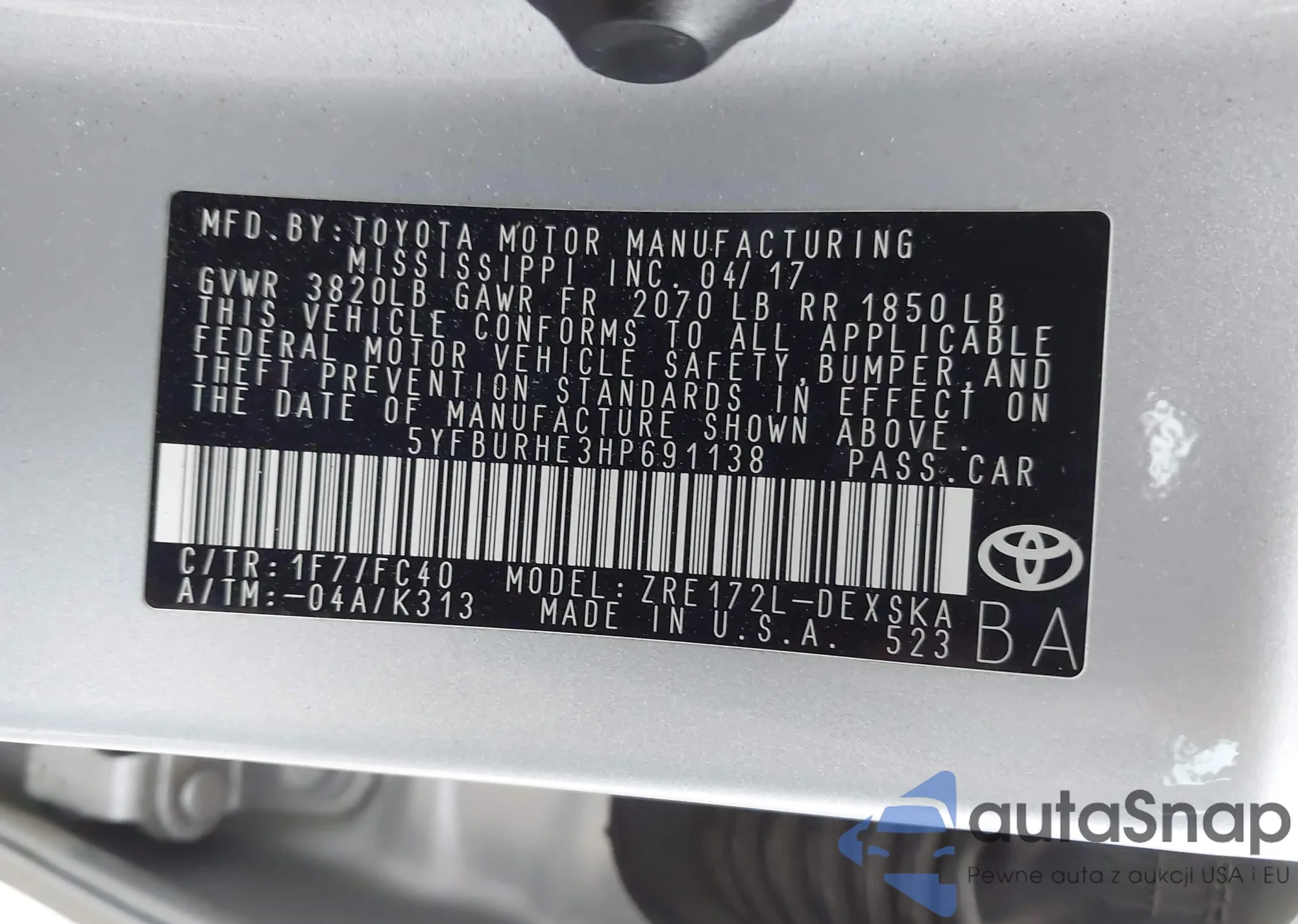• VIN 1NXBU4EE7AZ191303