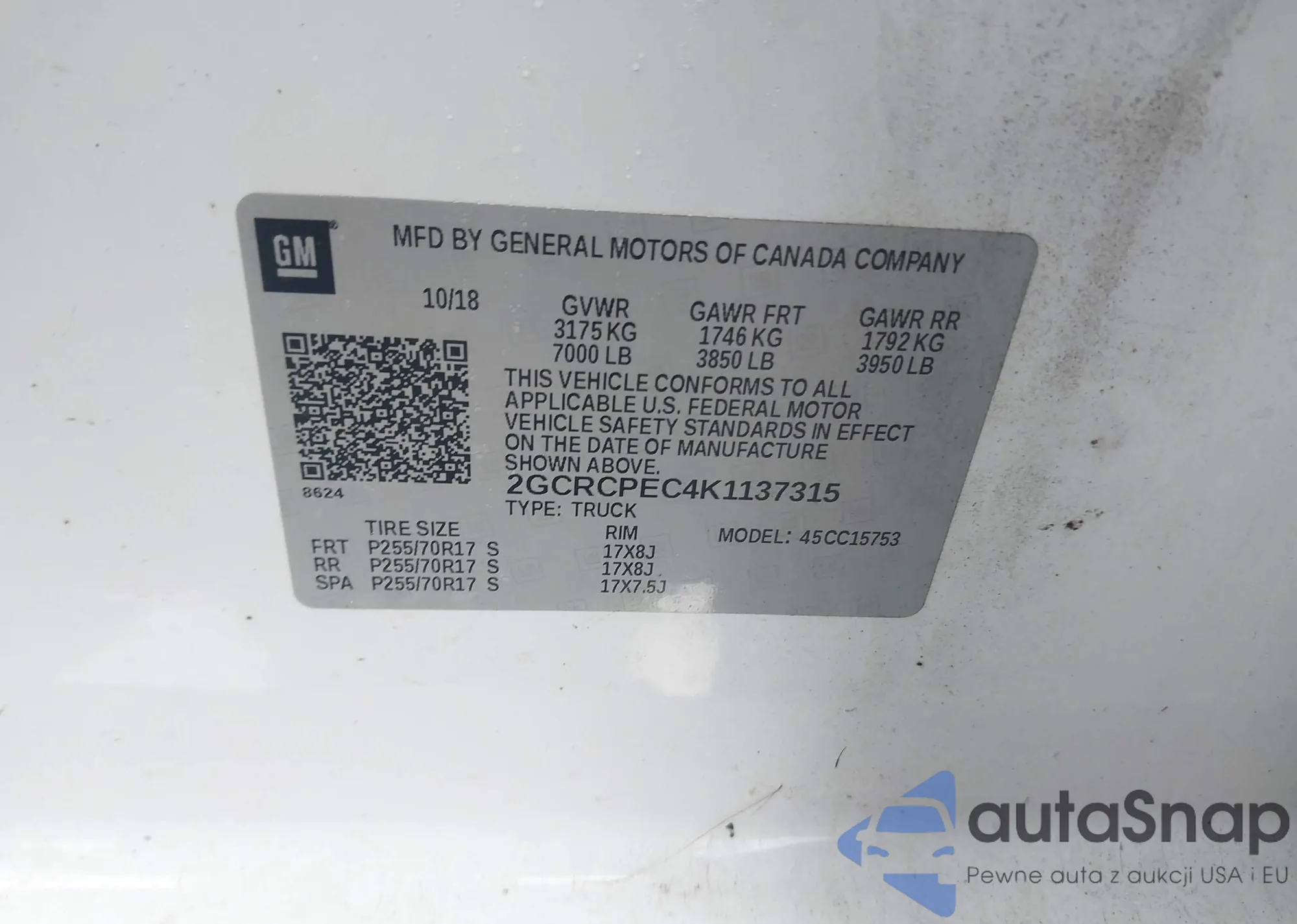 • VIN 2GCRCPEC4K1137315