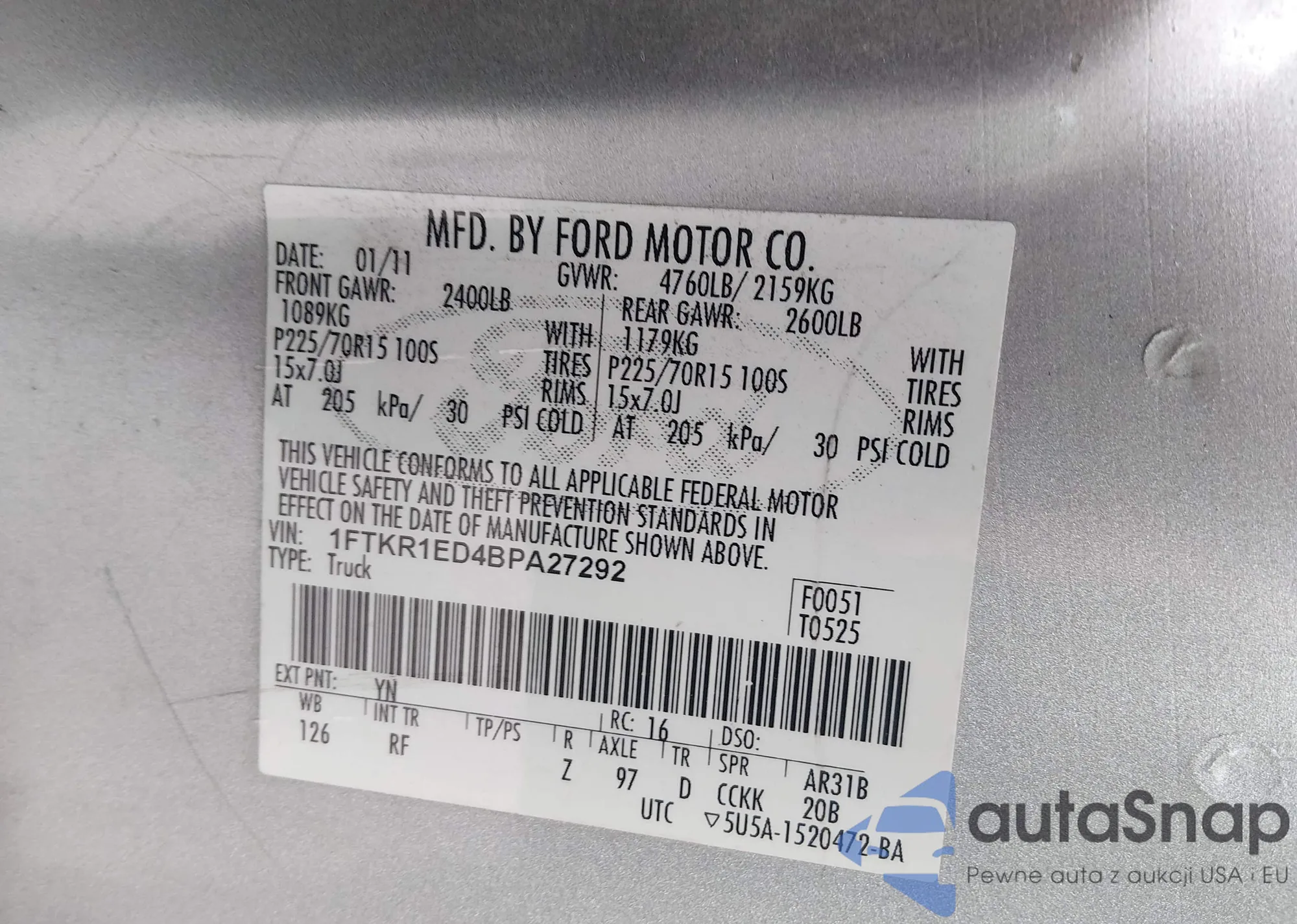 • VIN 1FTKR1ED4BPA27292